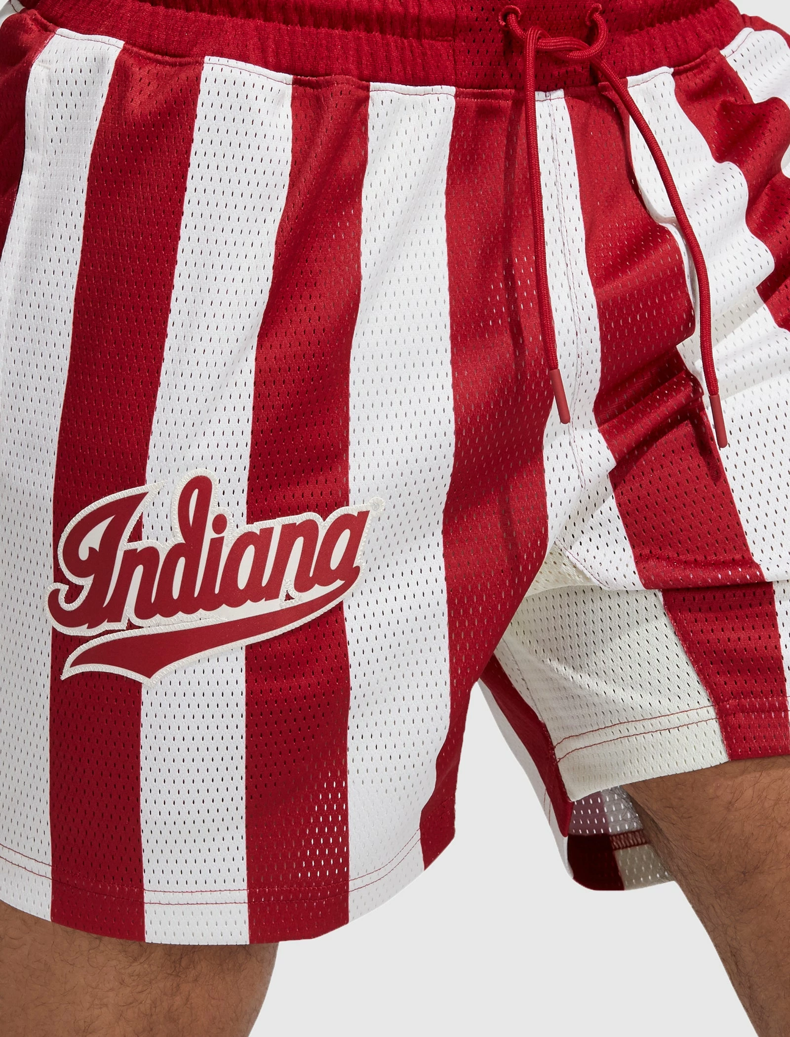 Mesh basketball shorts. Adjustable drawstring waistband. Two pockets at sides. Embroidered logos at side. Stripes throughout. Indiana University Hoosiers embroidered logos and graphics throughout. – 100% Recycled Polyester SKU: H56722