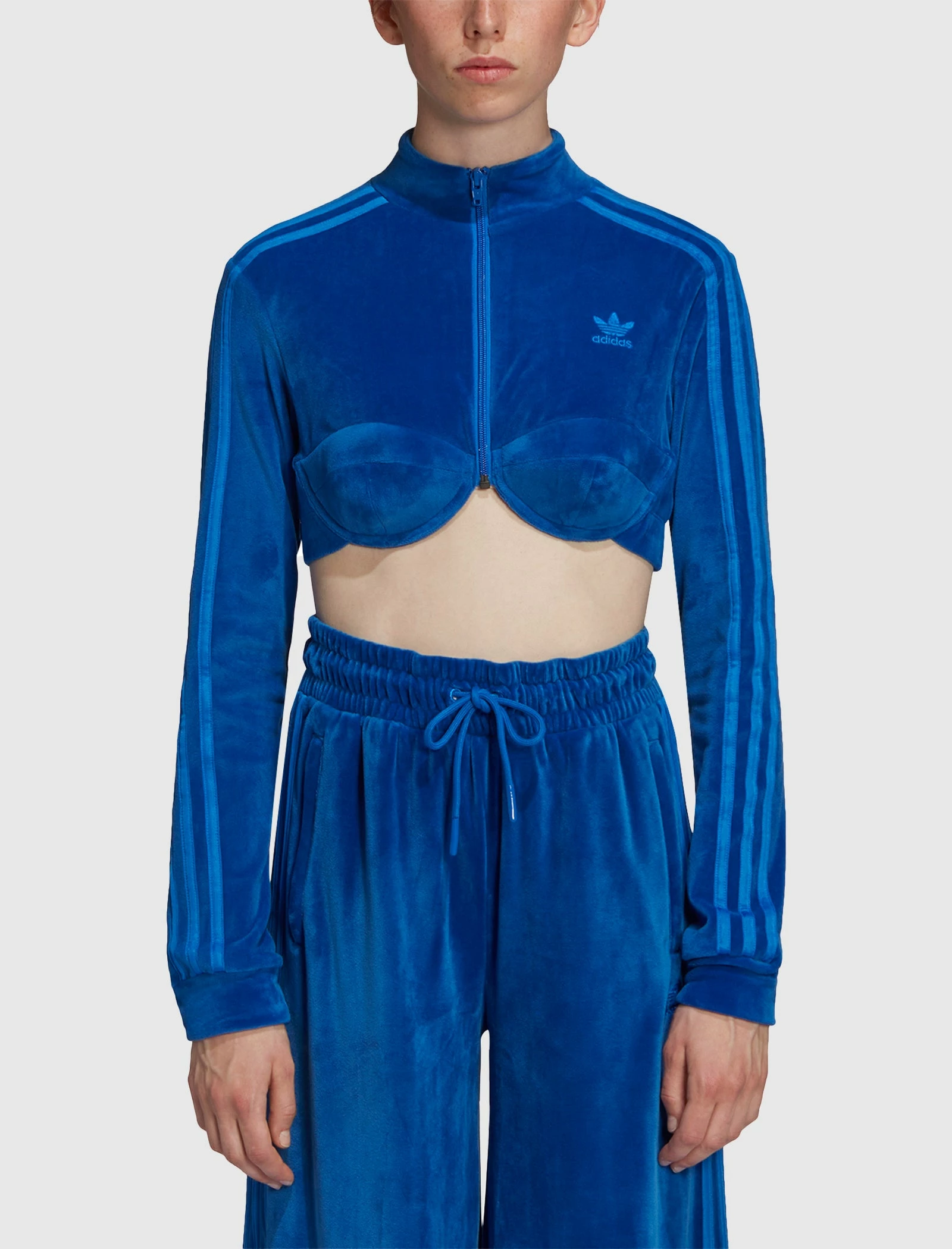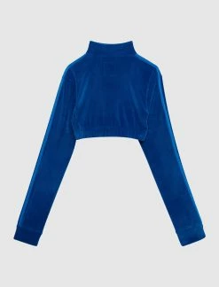 Velour cropped track top. Tight-fit. Mock neck. Embroidered logo at chest. Signature stripes at sleeves. Elasticized hem. Zip closure at front. – 93% Polyester, 7% Elastane Velour SKU: H50965