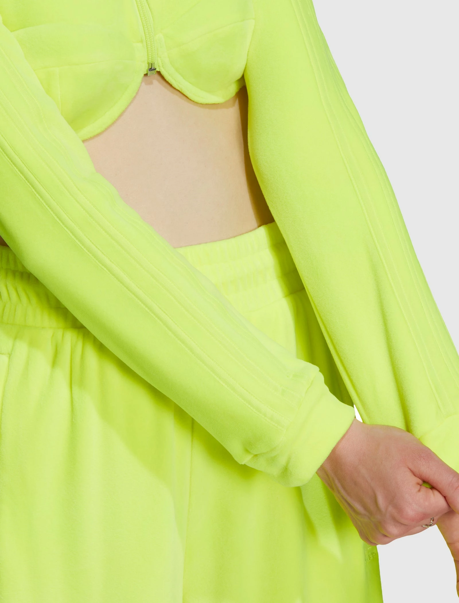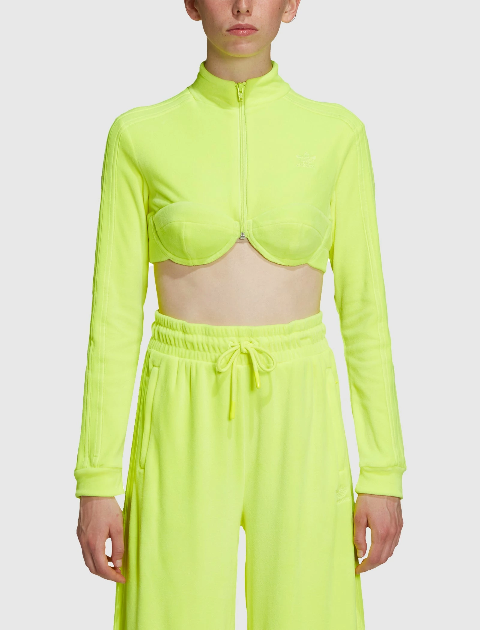 Velour cropped track top. Tight-fit. Mock neck. Embroidered logo at chest. Signature stripes at sleeves. Elasticized hem. Zip closure at front. – 93% Polyester, 7% Elastane Velour SKU: H50968