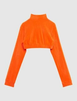 Velour cropped track top. Tight-fit. Mock neck. Embroidered logo at chest. Signature stripes at sleeves. Elasticized hem. Zip closure at front. – 93% Polyester, 7% Elastane Velour SKU: H50966