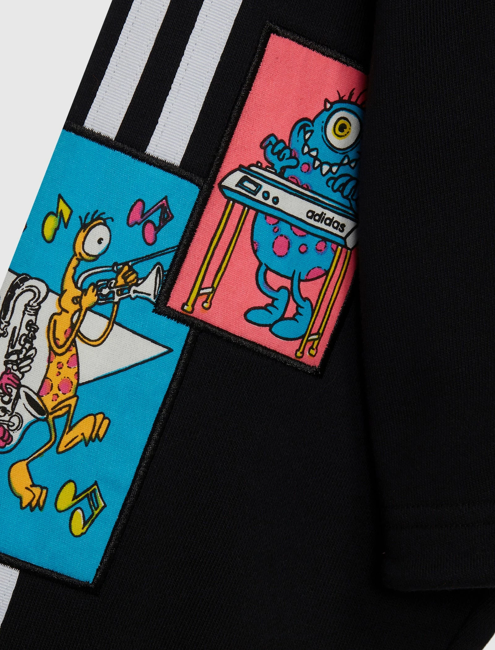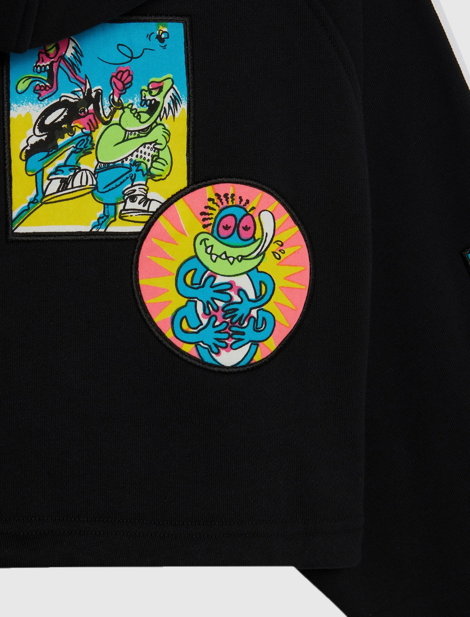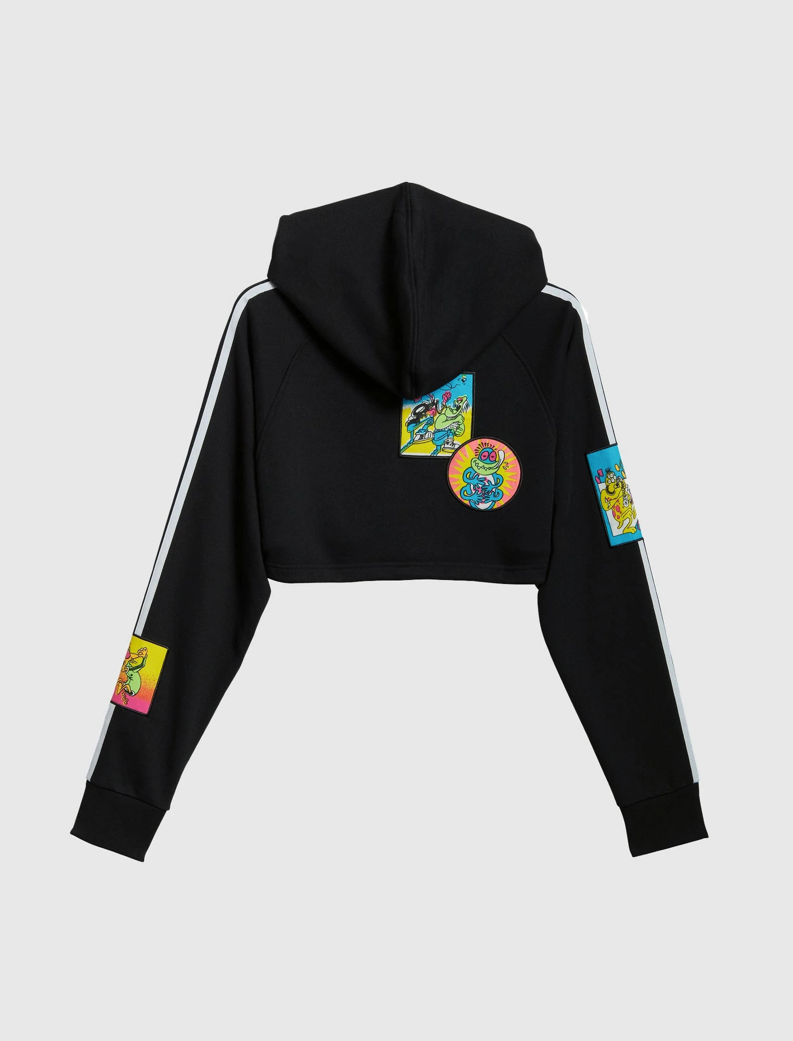 Loose-fit pullover crop hoodie. Embroidered logo featuring cartoon print at chest. Graphic cartoon patches throughout. Signature stripes at sleeves. Adjustable bungee-cords closures at hem. – 70% Cotton, 30% Recycled Polyester SKU: H53361