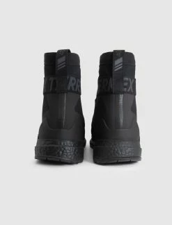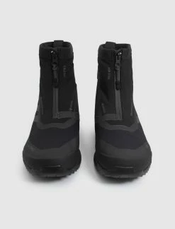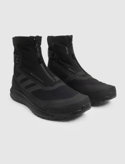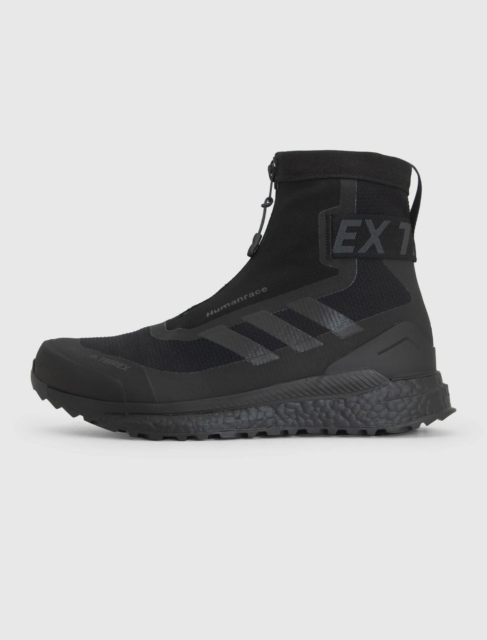 High top sneaker. Mesh upper. Sock-like silhouette. Fused overlay going around the toe, sidewall, and heel. Fused striped logo on the side. Zip closure on the forefoot. Elastic strap going around the back of the ankle. Boost midsole. Rubber outsole. – Mesh upper SKU: GZ9820