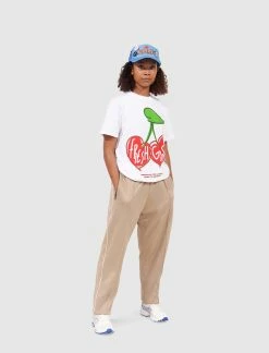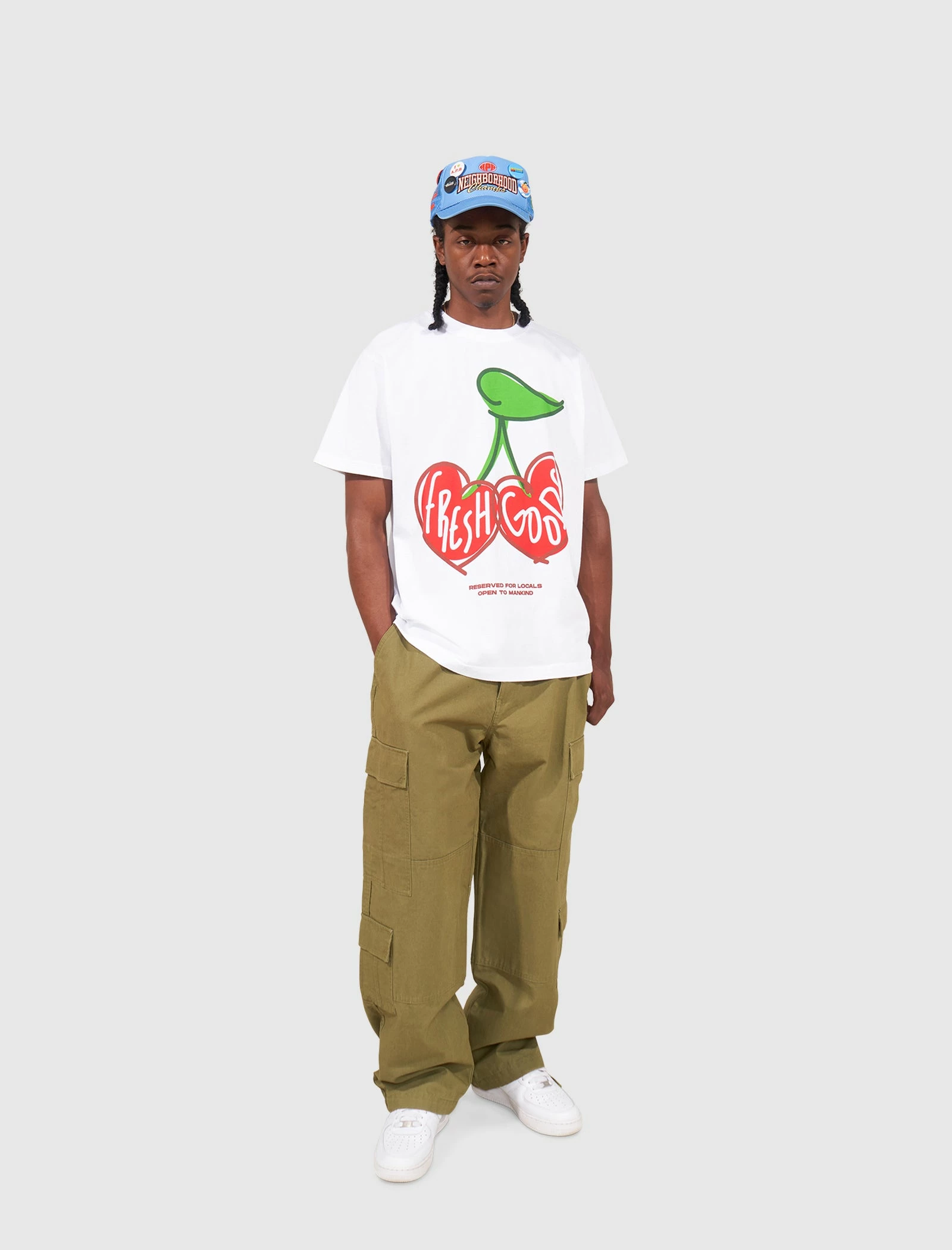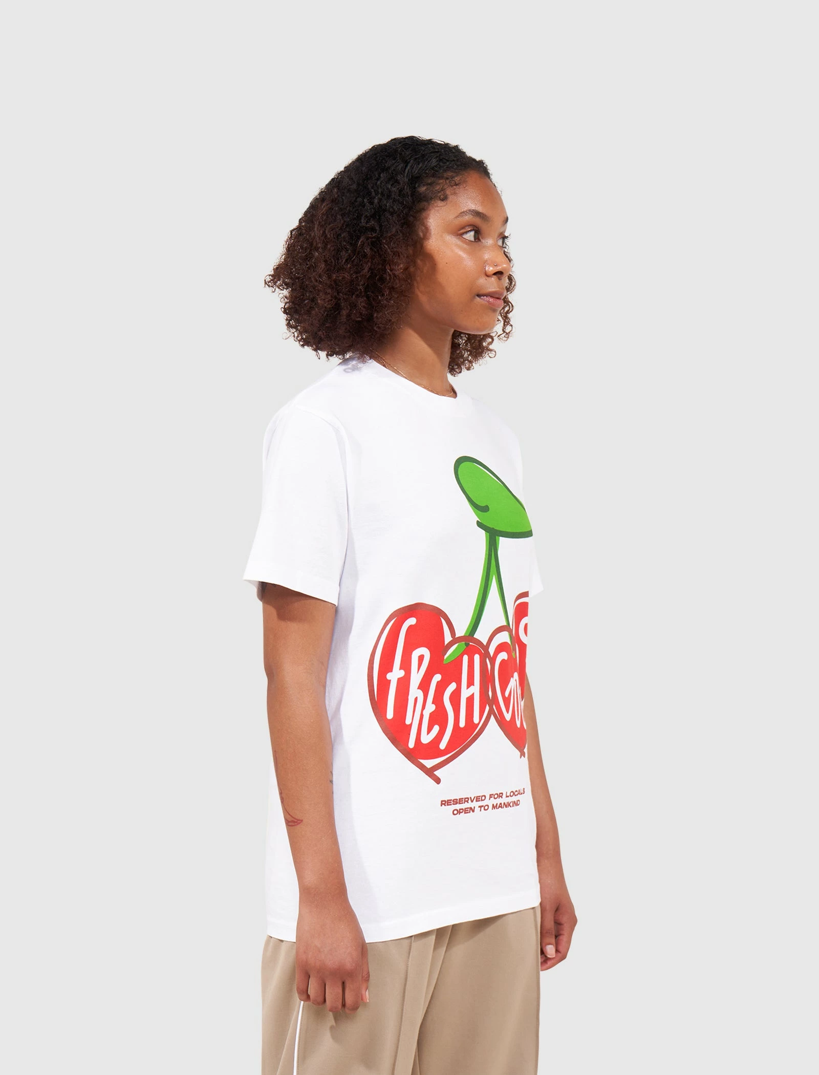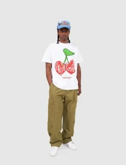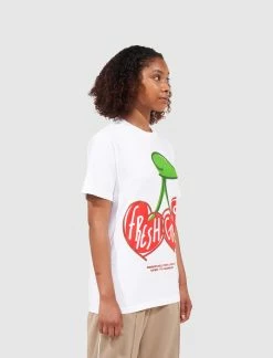 Short sleeve cotton t-shirt. Crewneck. Graphic cherry print at front featuring texts. Graphic texts and logo text at back. – 100% Cotton SKU: APB-002-TSHIRT01-WHT