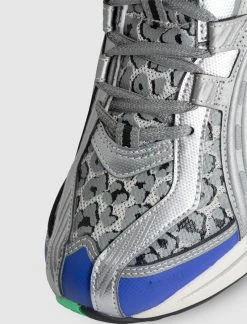 Low top sneaker. Mesh base with a graphic printed on top. Synthetic textile details stitched throughout the upper. Piping stitched down the sides in the shape of a logo. Front lacing. Foam and gel midsole. Rubber outsole. – Synthetic textile upper SKU: 1201A018-020