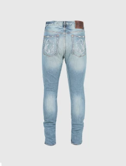 Light-wash denim jeans. Five-pockets. Distressed detail at front. Embroidered logo print at back pockets. Zip-fly closure at front. – 99% Cotton, 1% Spandex SKU: 821-1106