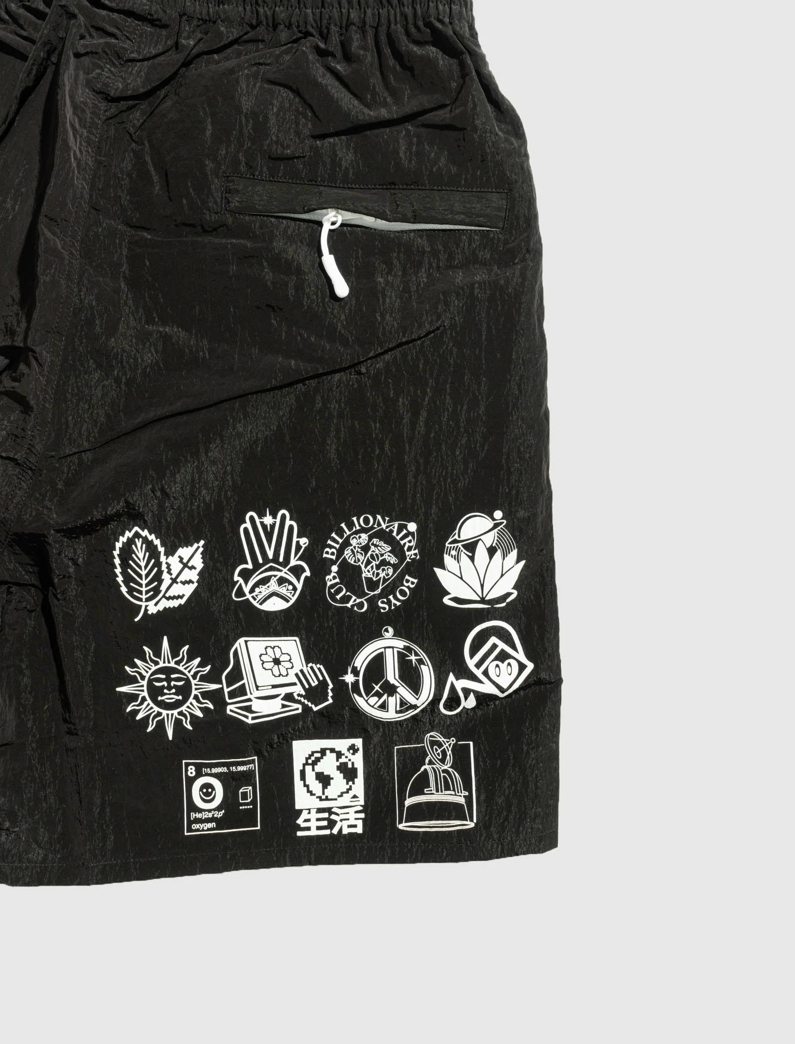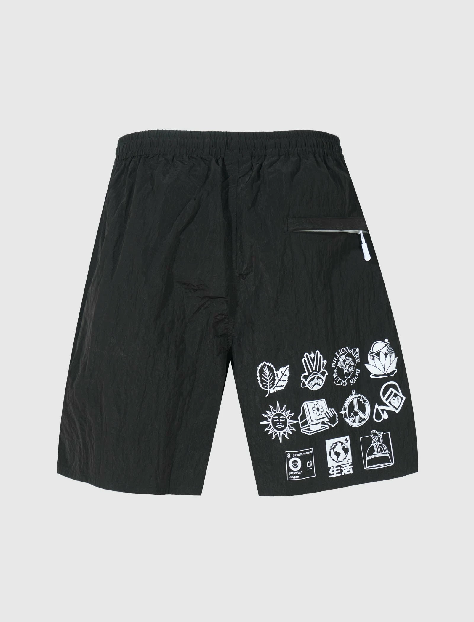 Nylon shorts. Adjustable drawstring waistband. Two pockets at sides. Zip pocket at back. Graphic logo text, text and prints throughout. – 100% Nylon SKU: 821-4100-BLK