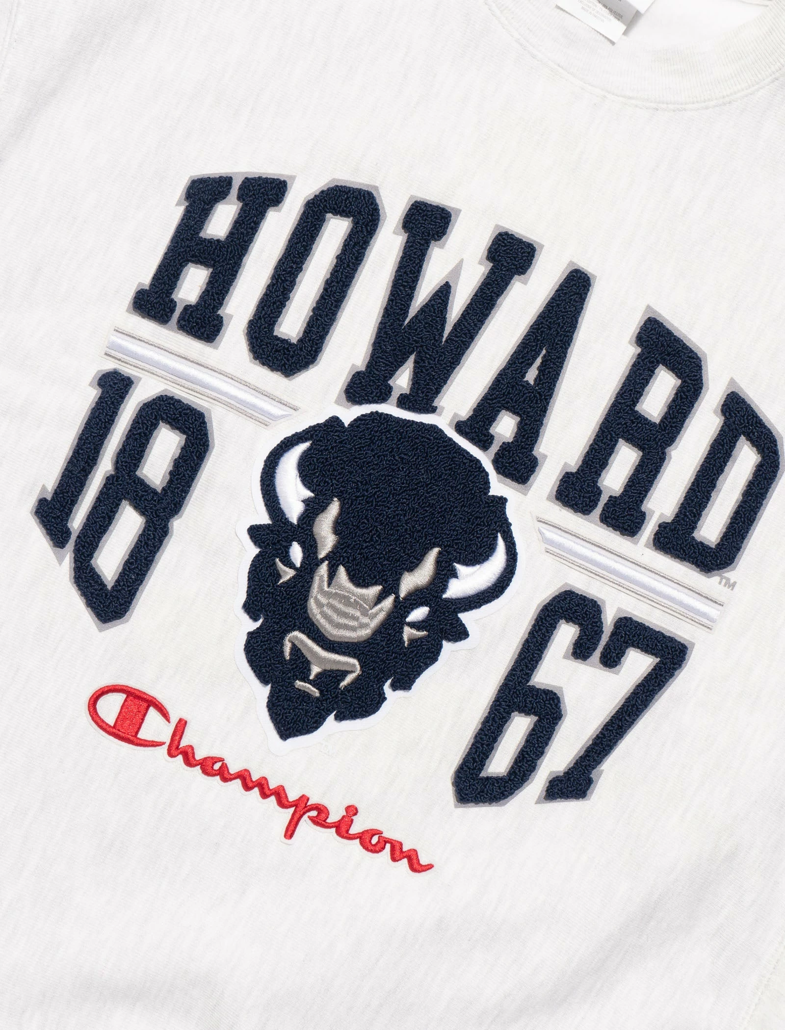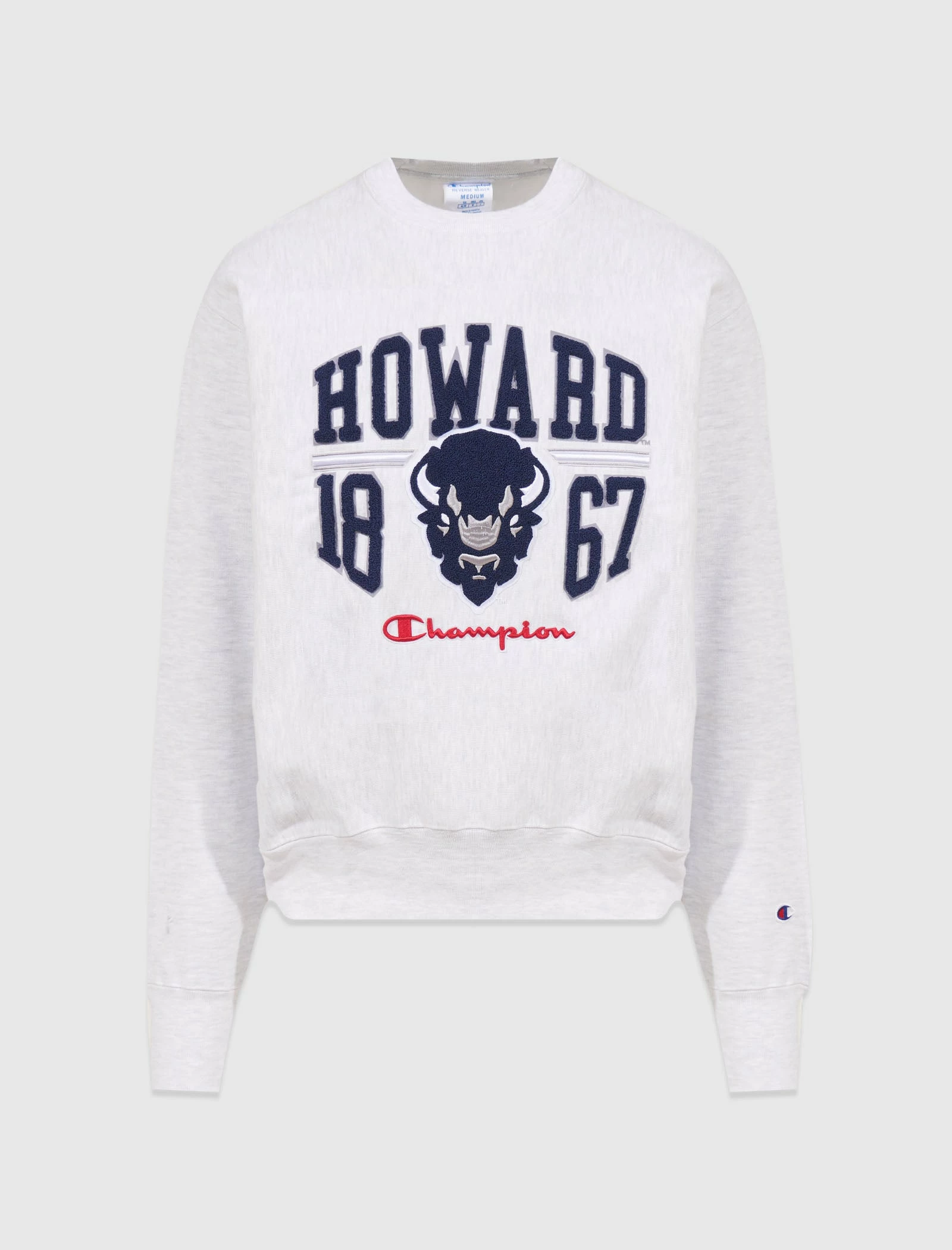 Pullover cotton-blend sweatshirt. Crewneck. Embroidered college logo text, print and date at front featuring brand logo text at front. – 82% Cotton, 18% Polyester SKU: HOWARD-CREWNECK