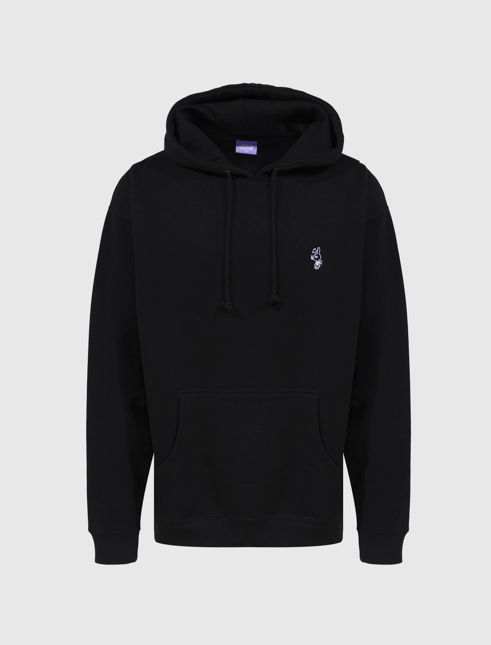 Pullover hoodie. Adjustable drawstring hood. Embroidered bunny at chest. Kangaroo pocket at front. Graphic print and text at back. – 100% Cotton SKU: CW11-H02-BLK