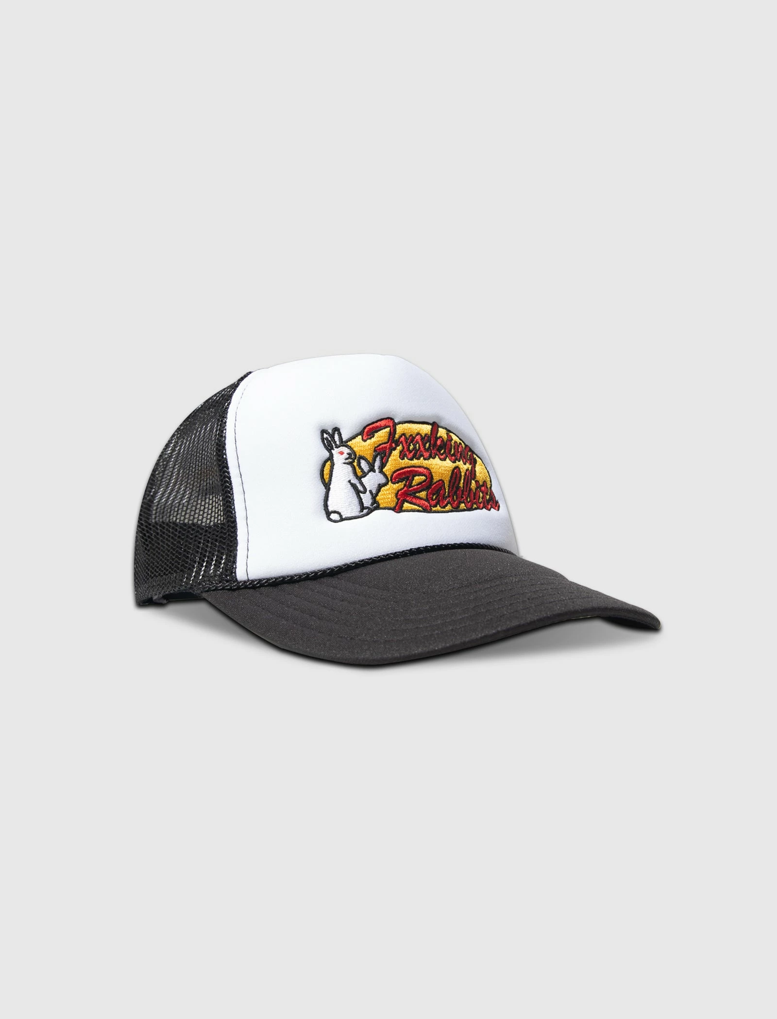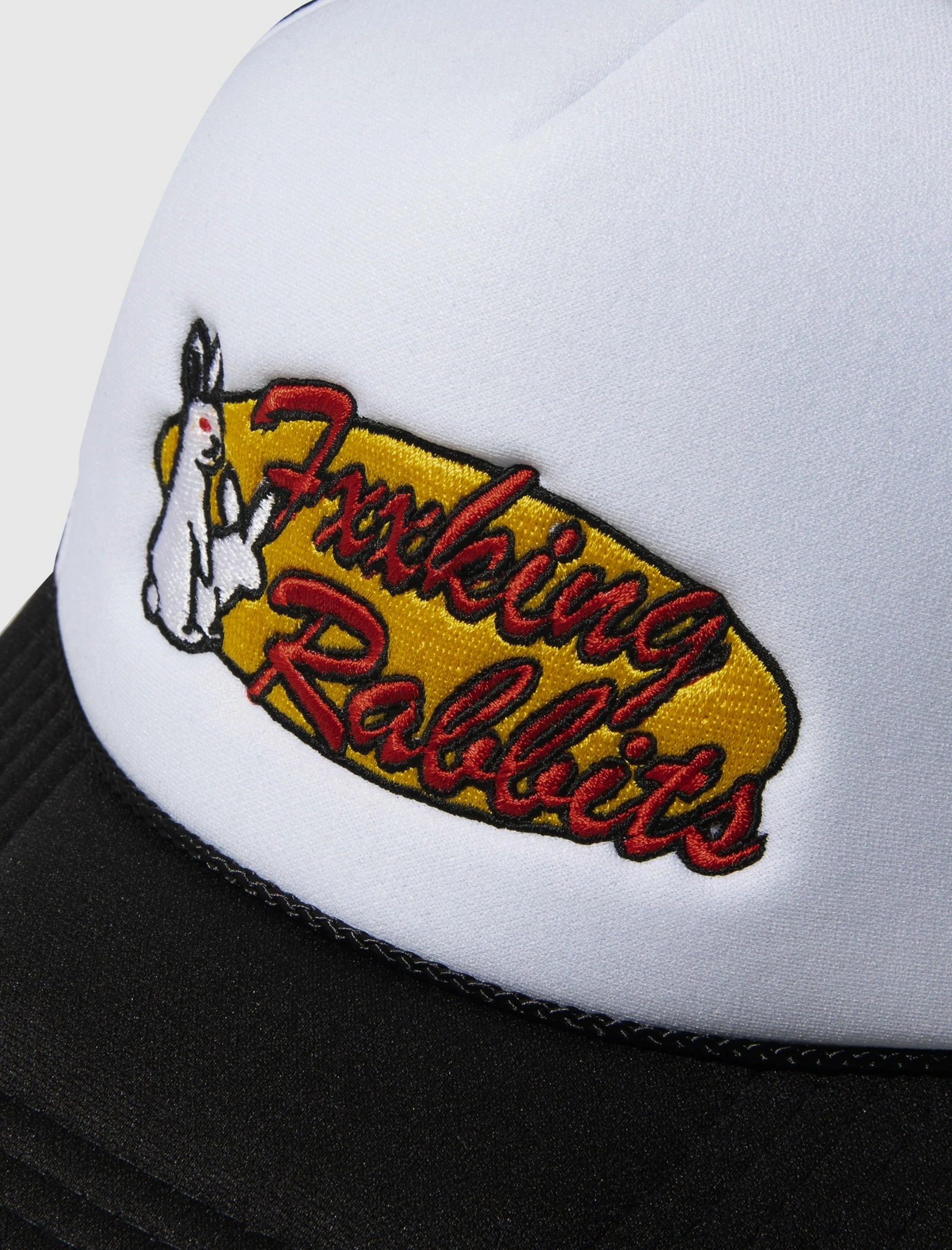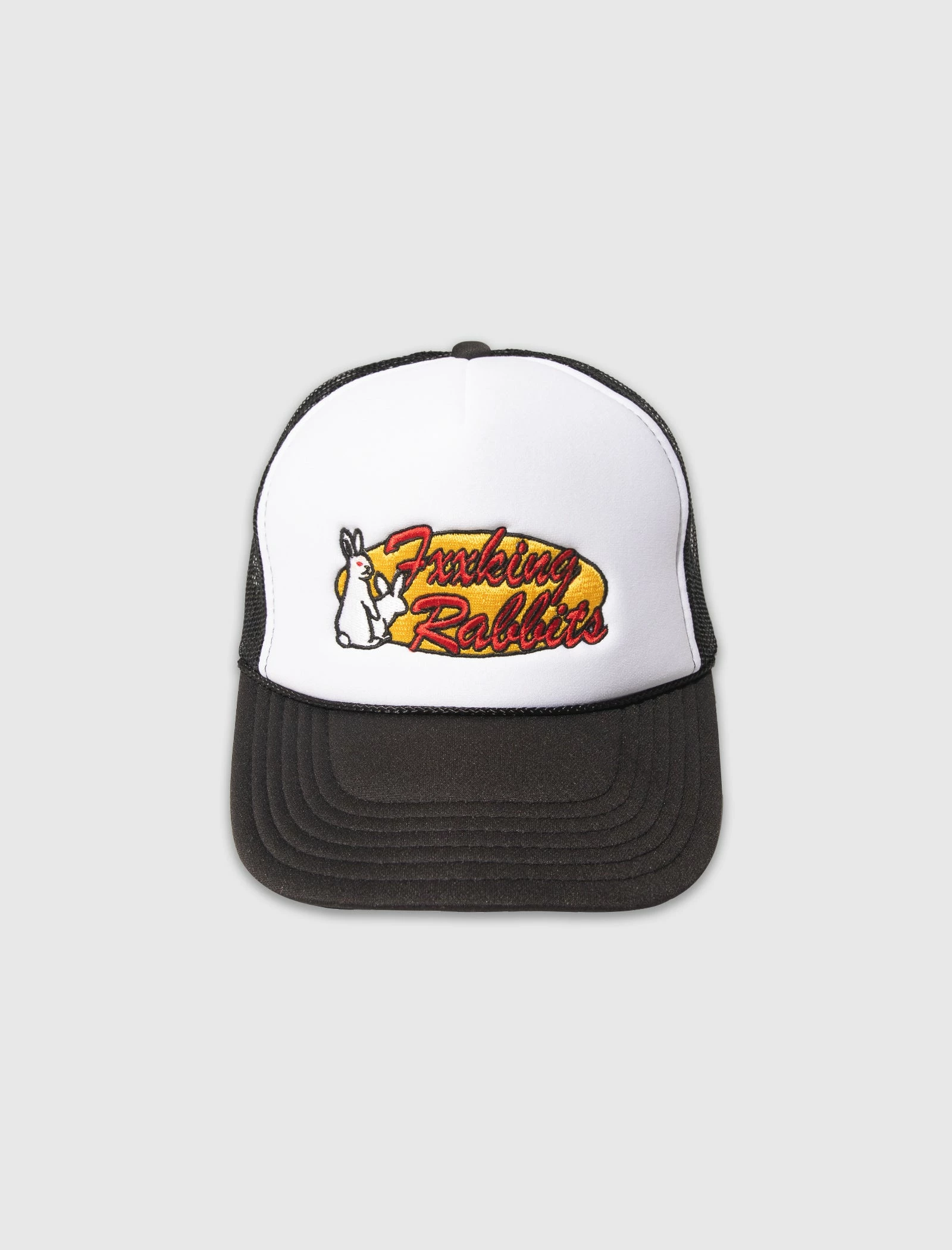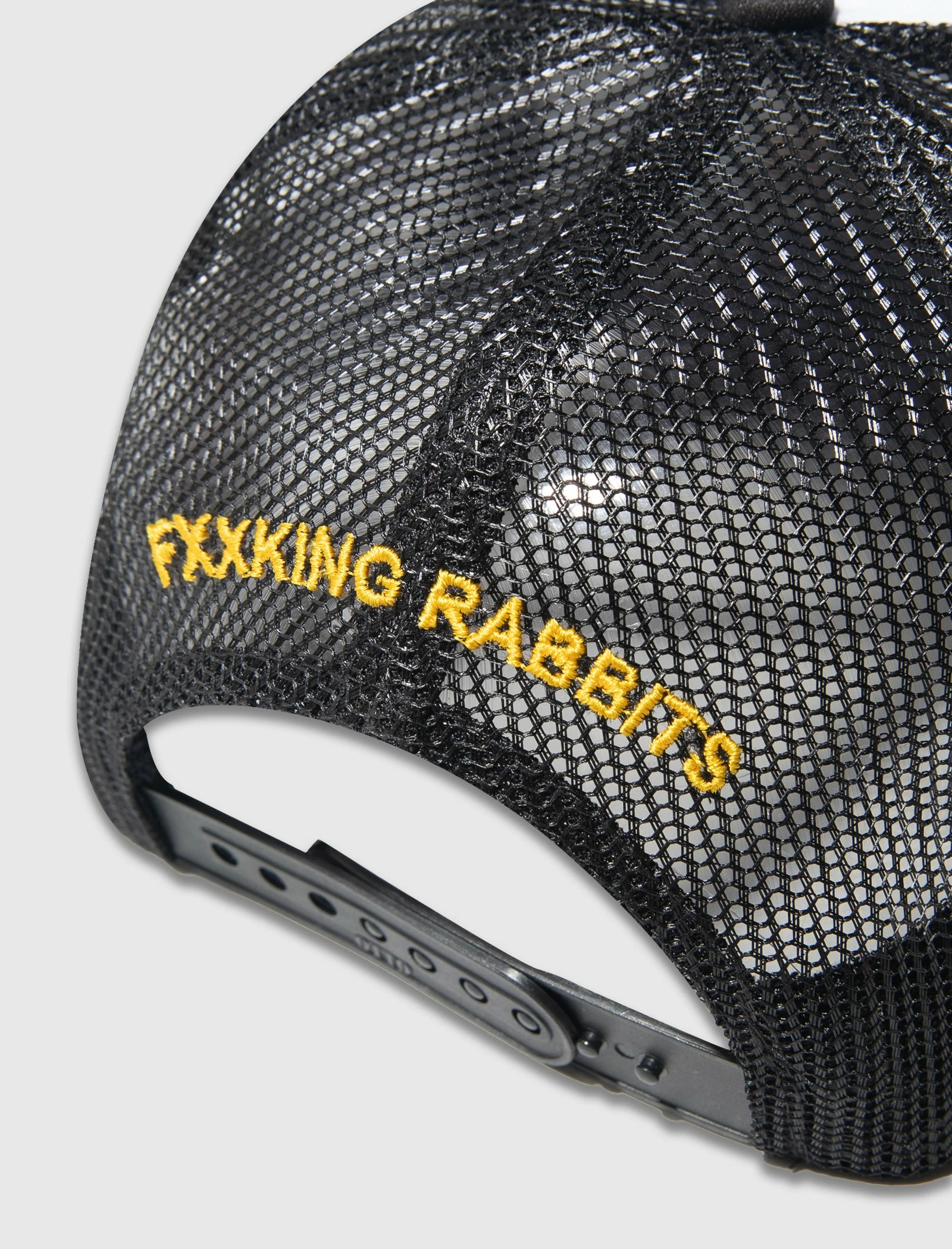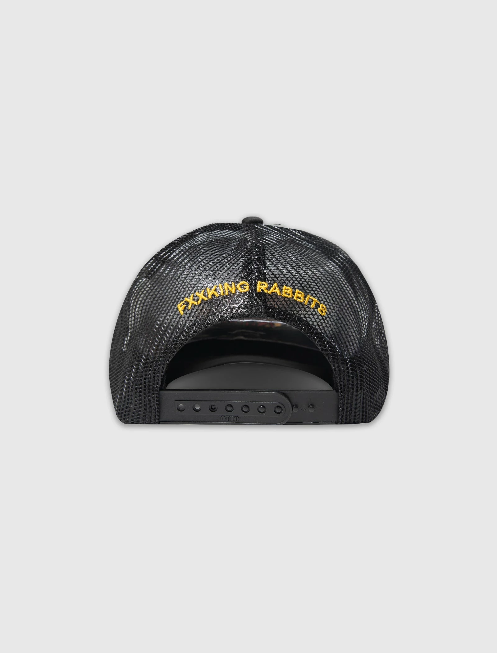 Trucker hat. Embroidered logo text and print at front. Curved brim. Mesh panels. Embroidered logo text at back. Snapback closure. – 100% Polyester SKU: FRA924-BLACK