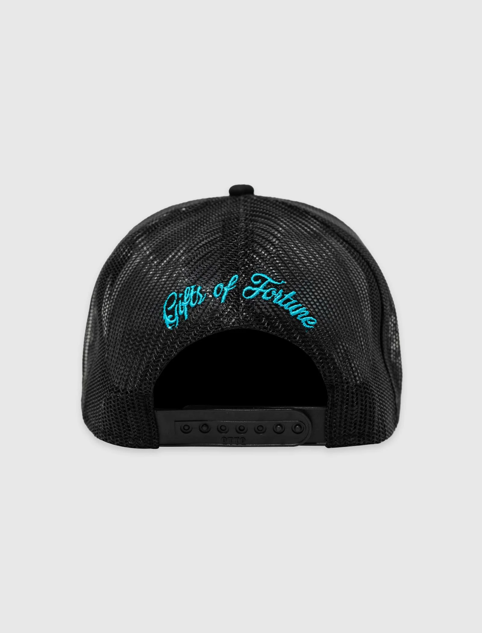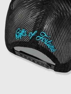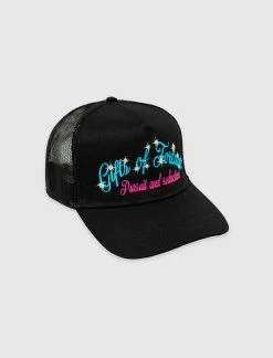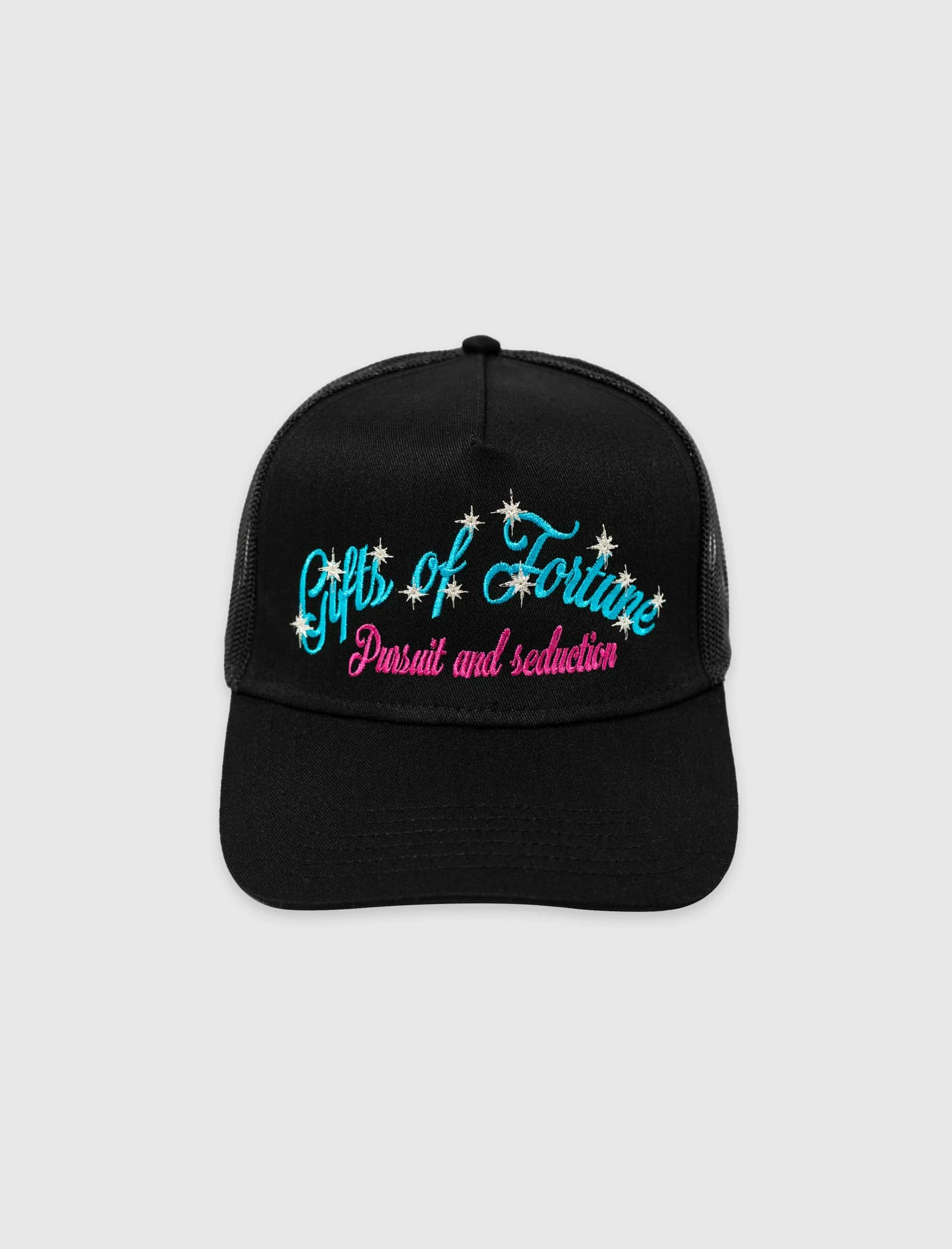 Cotton-blend trucker hat. Curved brim. Embroidered logo text and text at front and back. Mesh back featuring adjustable snapback closure. – 65% Polyester, 35% Cotton SKU: PURSUTRUK20050-BLK