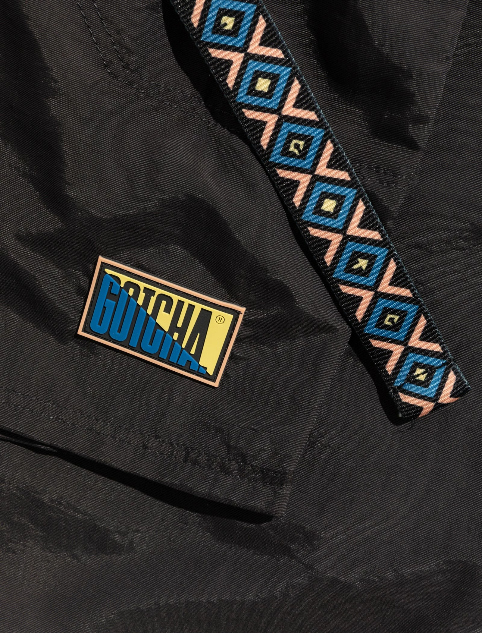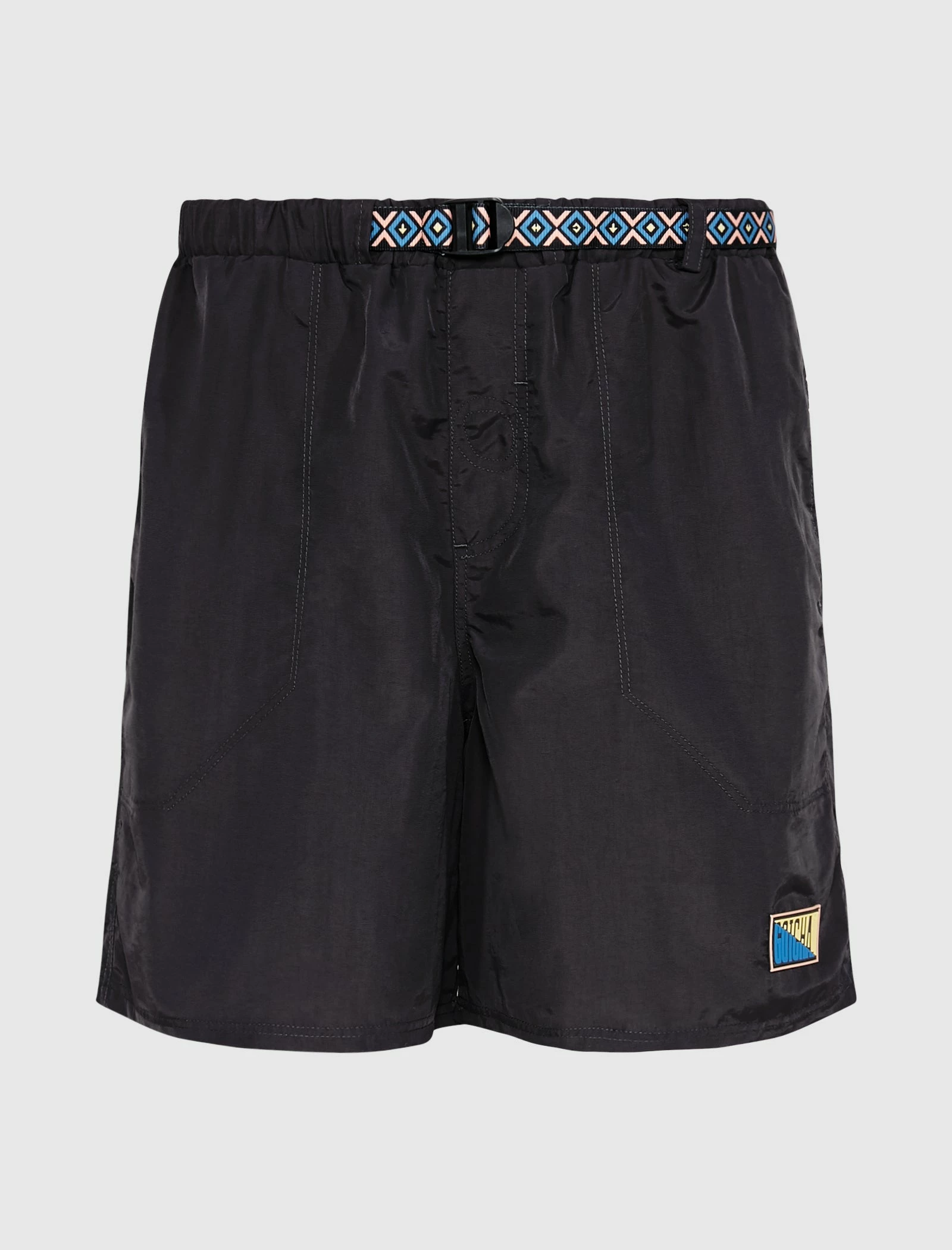 Elasticized waistband featuring patterned belt. Two pockets at sides. Single pocket at back. Rubber logo patch at front. – 100% Nylon SKU: 111-4104