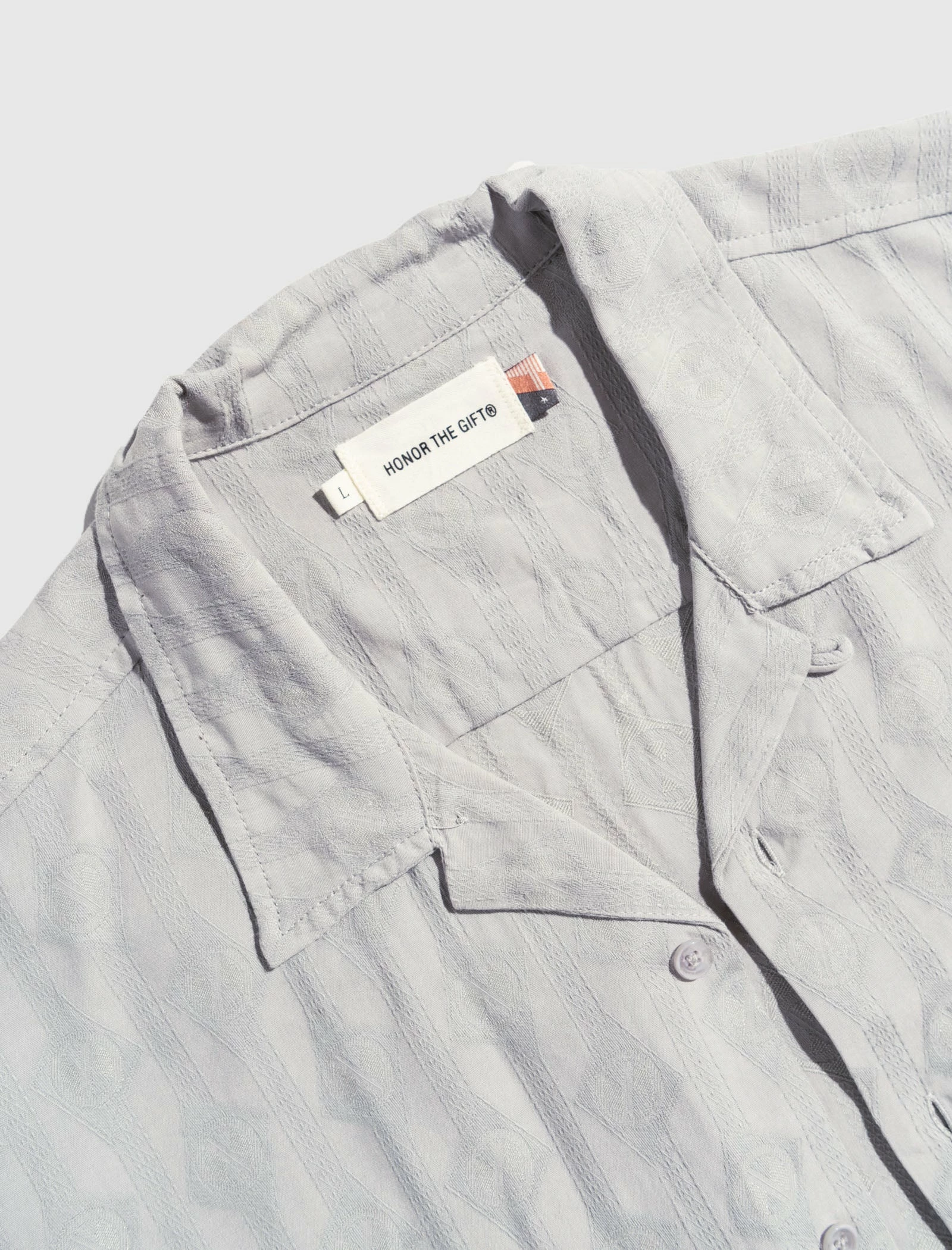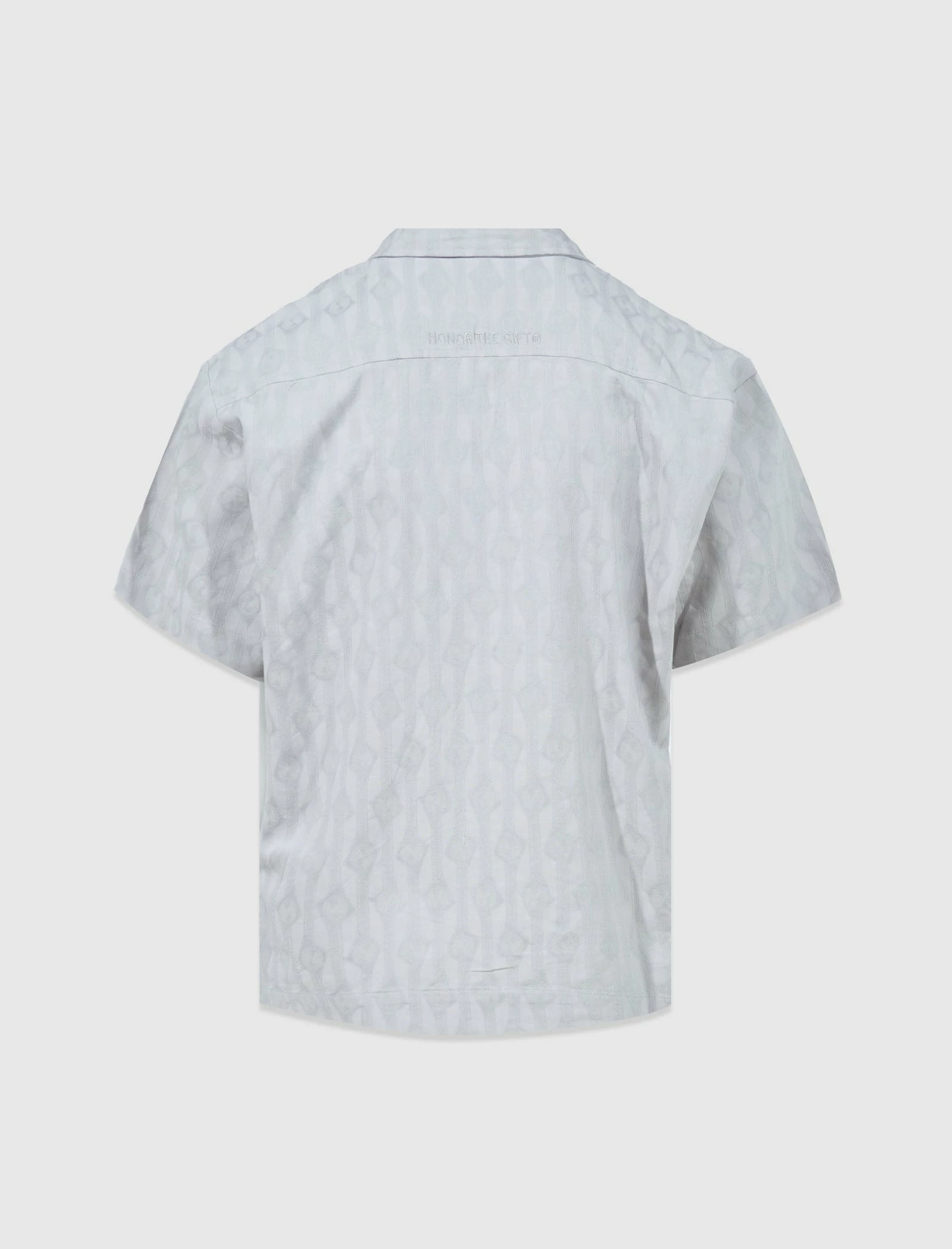 Short sleeve shirt. Camp collar. Single pocket at chest. Jacquard print throughout. Embroidered logo text at back. Button closures at front. – 100% Cotton SKU: HTG220230-GRY