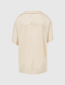 Lightweight knit short sleeve shirt. Camp collar. Embroidered logo and logo text at chest. Embroidered graphic prints above hem. Embroidered text at back. Button closures at front. – 78% Tencel, 22% Cotton SKU: WHTG220230-BONE