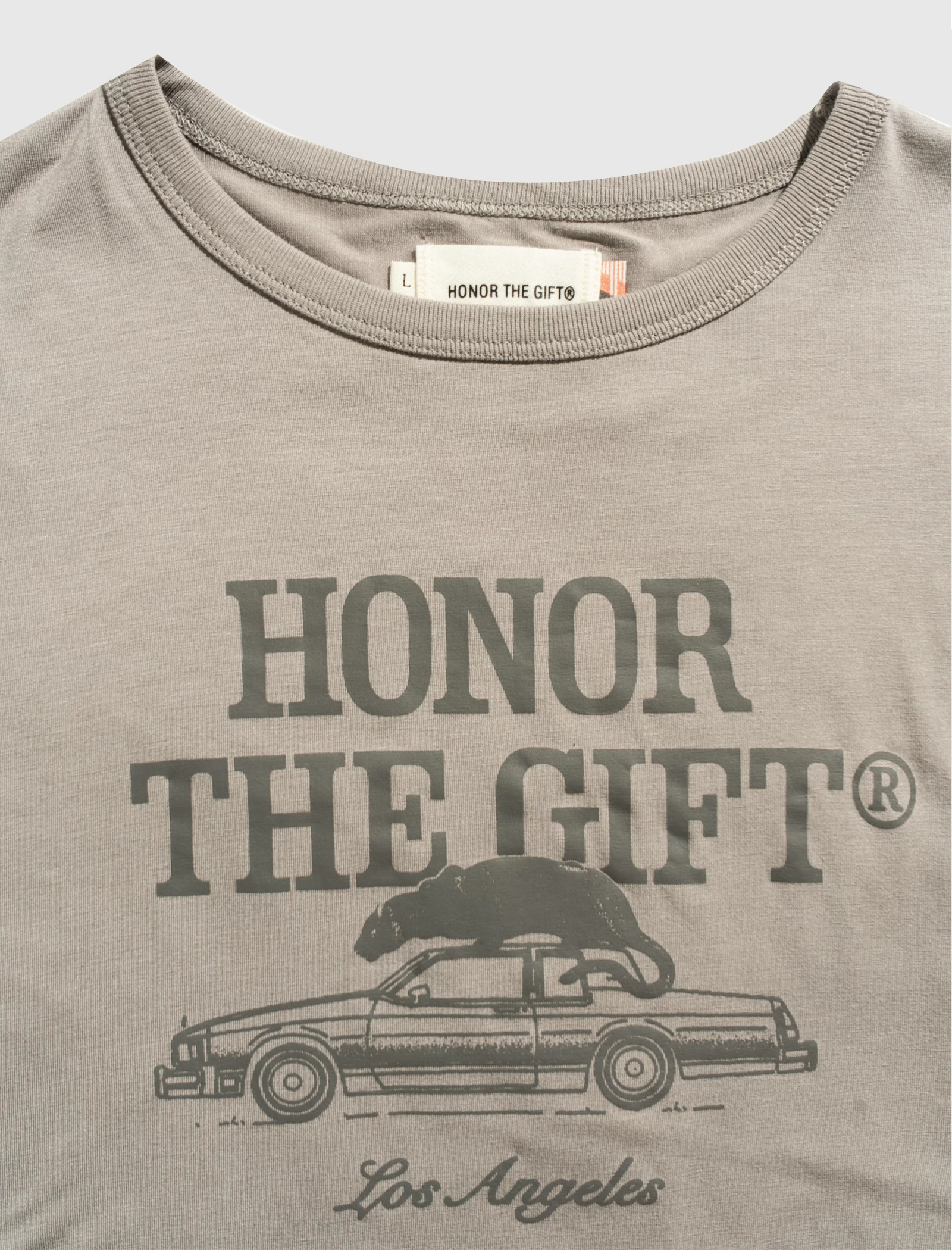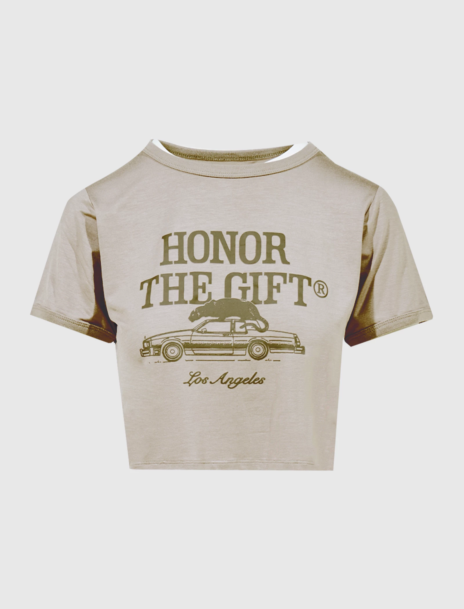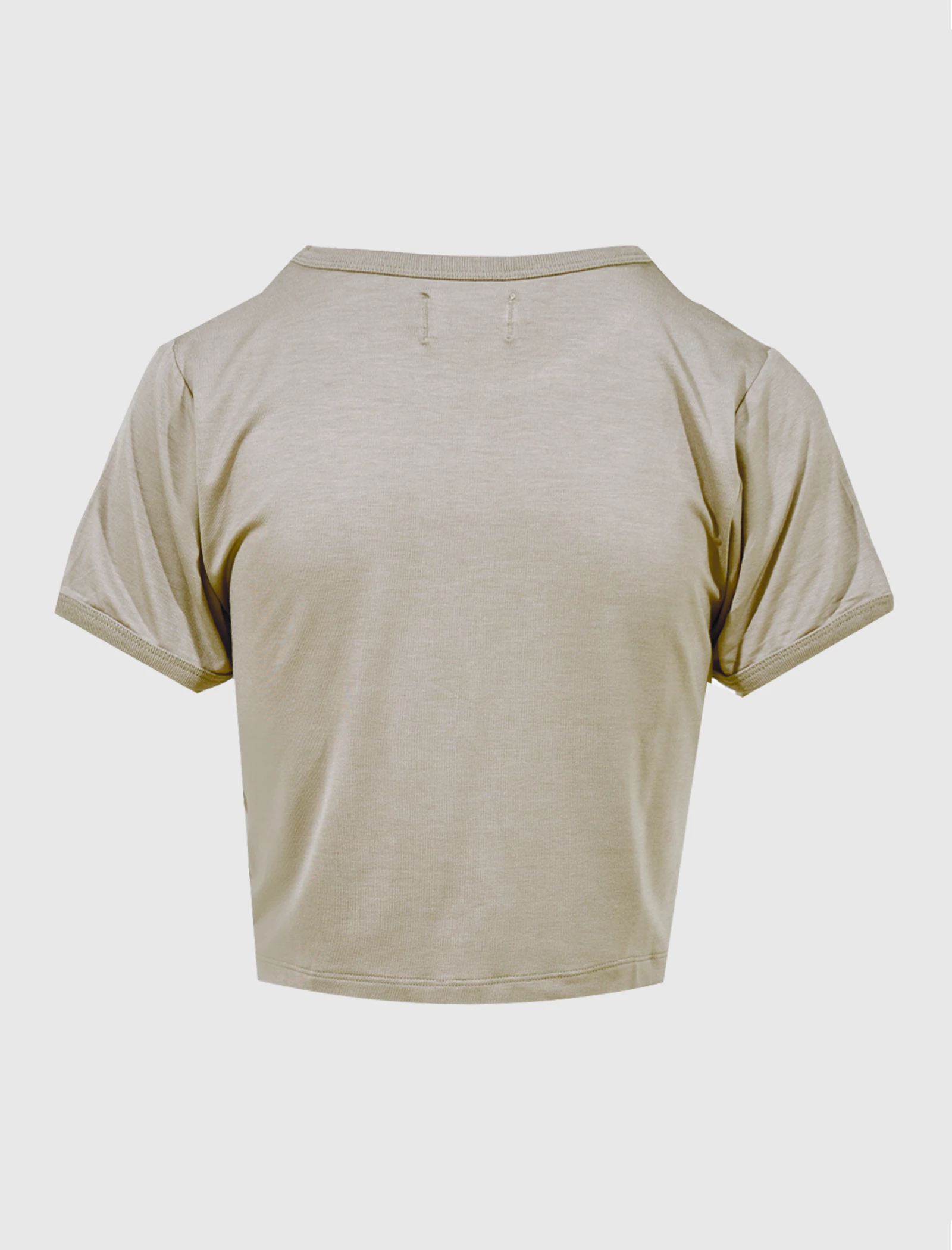 Short sleeve cropped tee. Crewneck. Graphic logo text and print at front. Woven brand label at side seam. – 95% Rayon, 5% Spandex SKU: WHTG220291-GRY