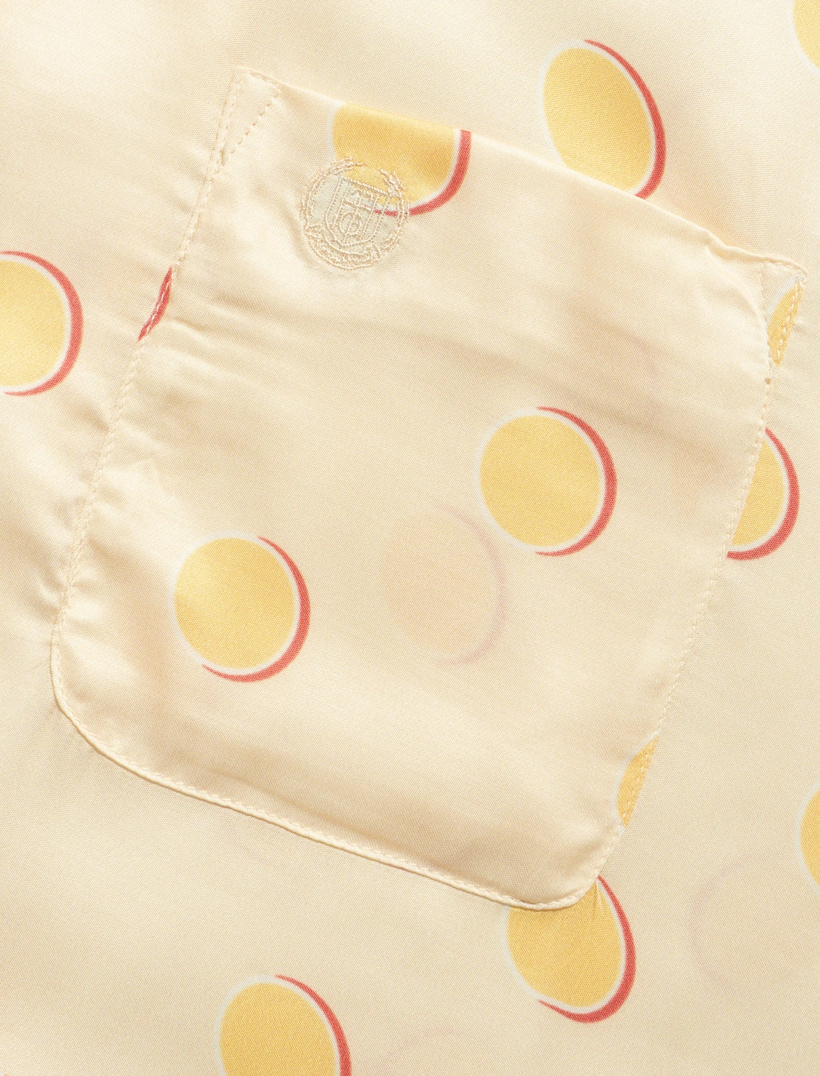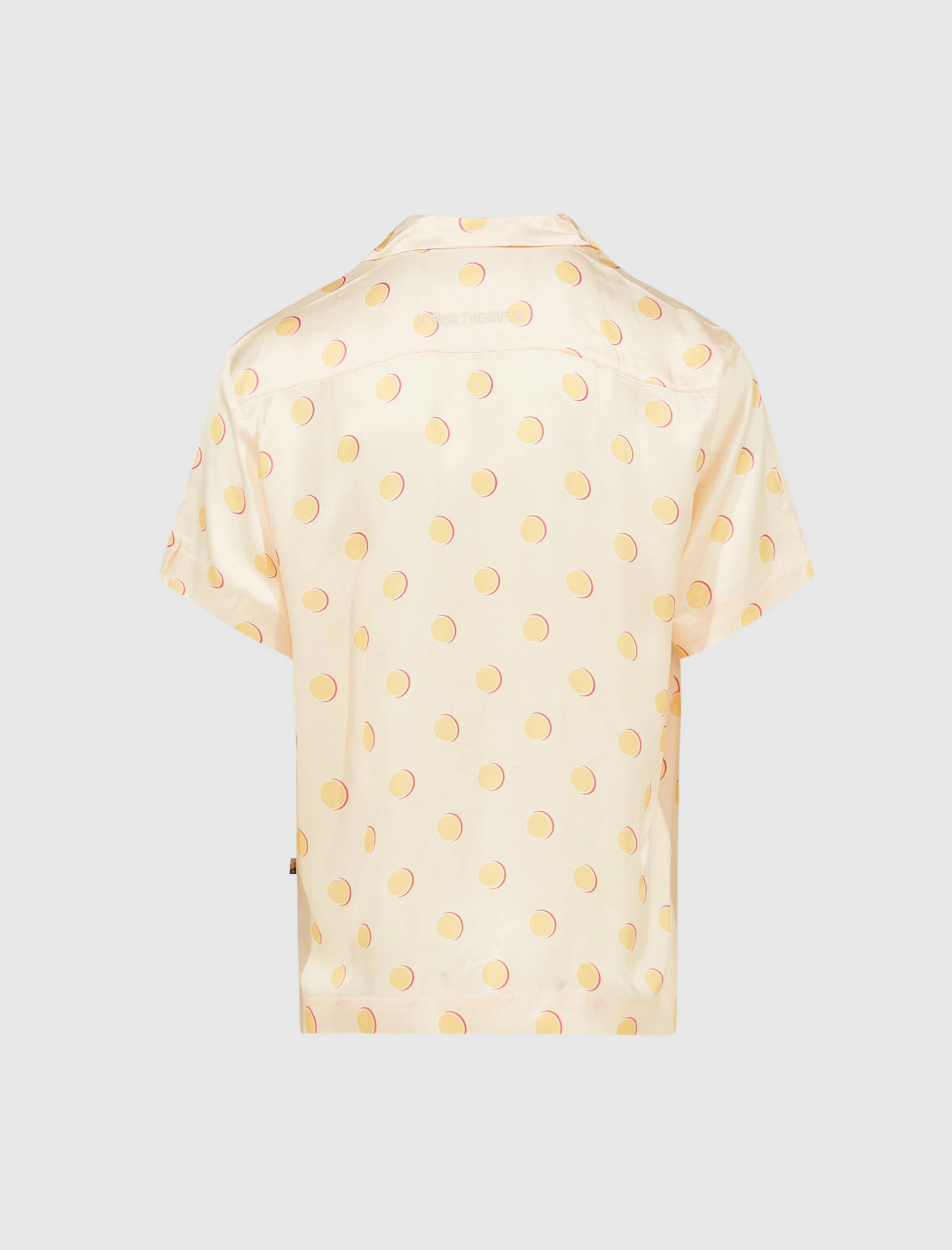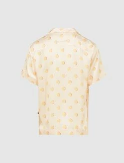 Satin shirt. Camp collar. Single pocket featuring embroidered logo print at chest. Embroidered logo text at back. Polka dot print throughout. Button closures at front. – 53% Viscose, 47% Rayon SKU: HTG220123