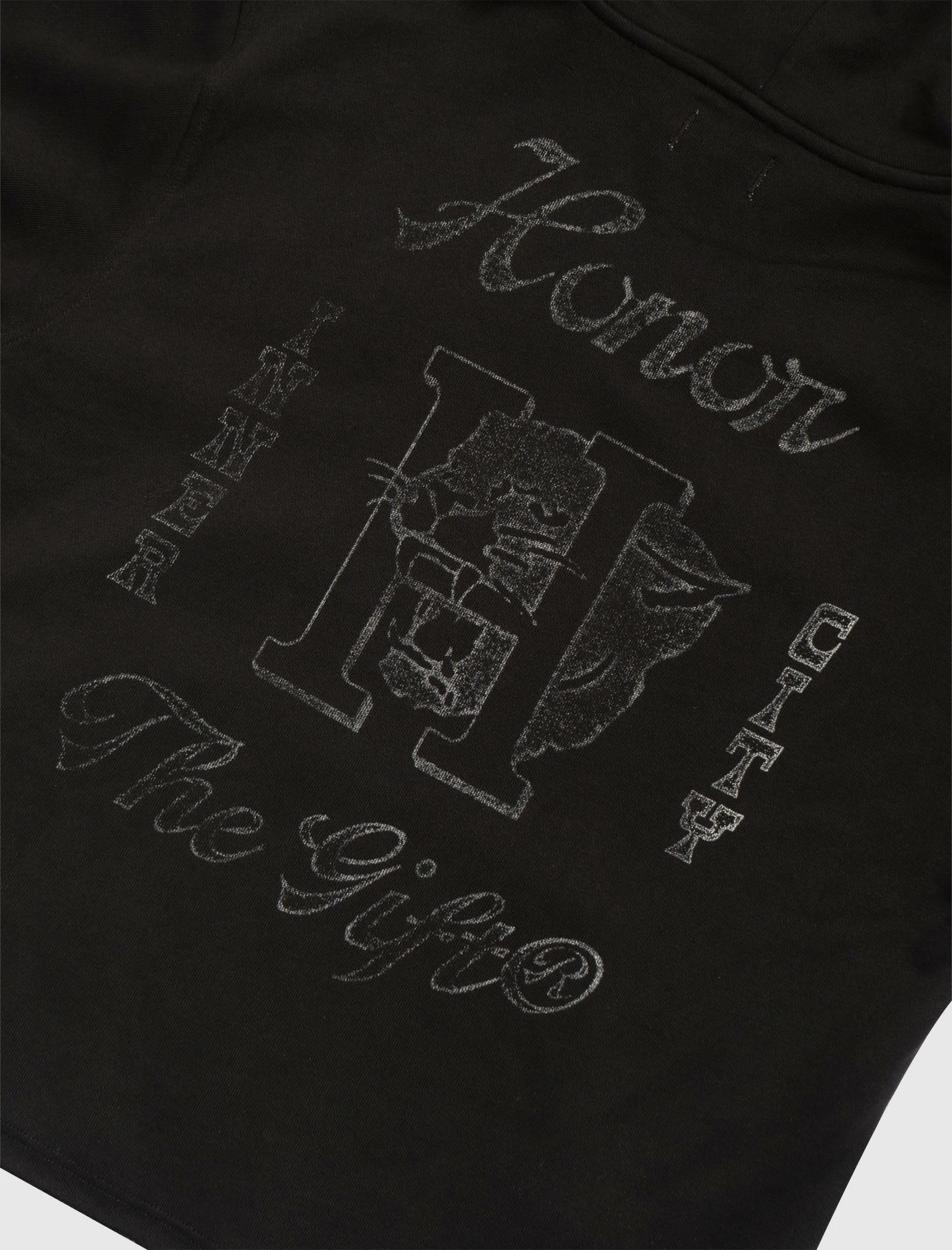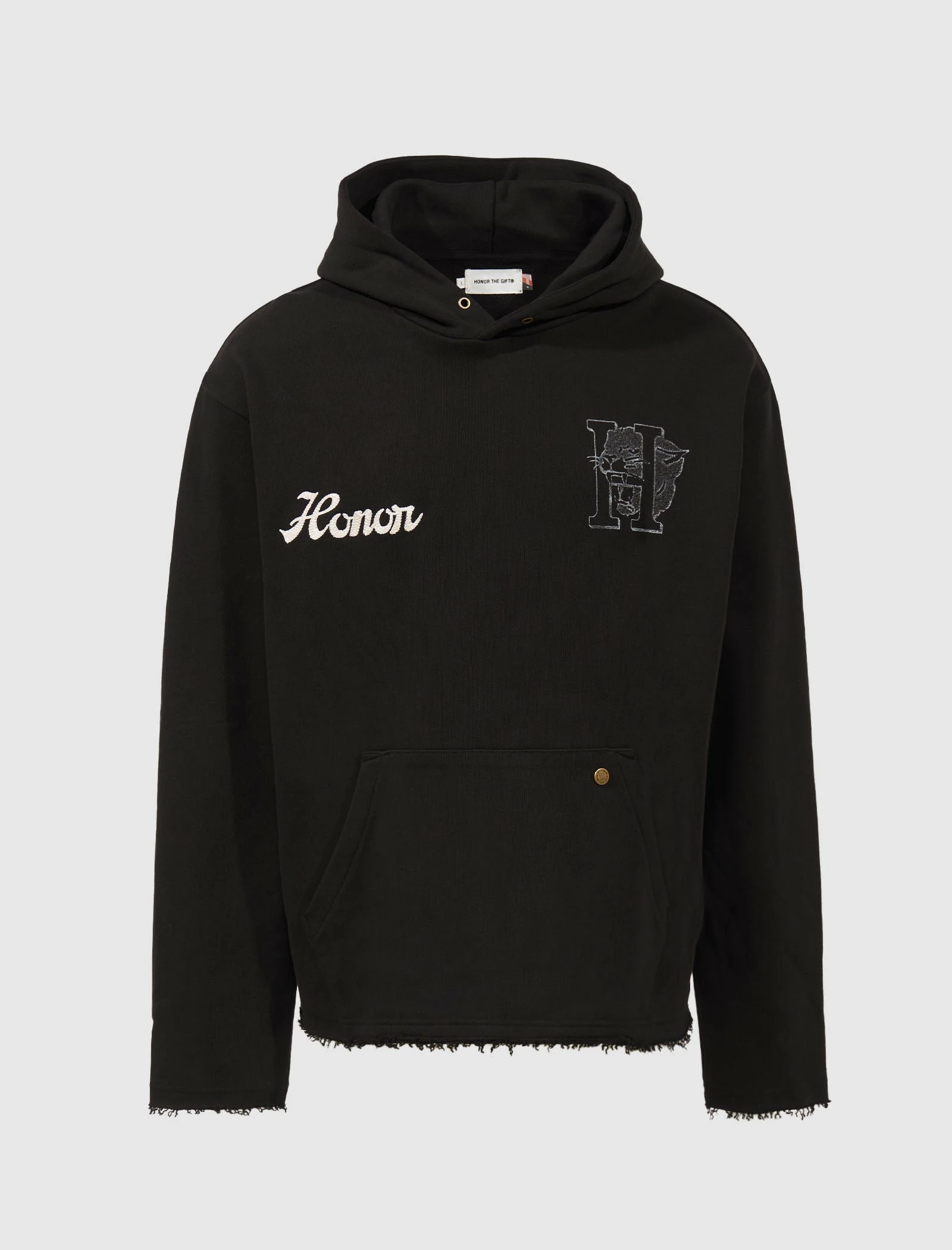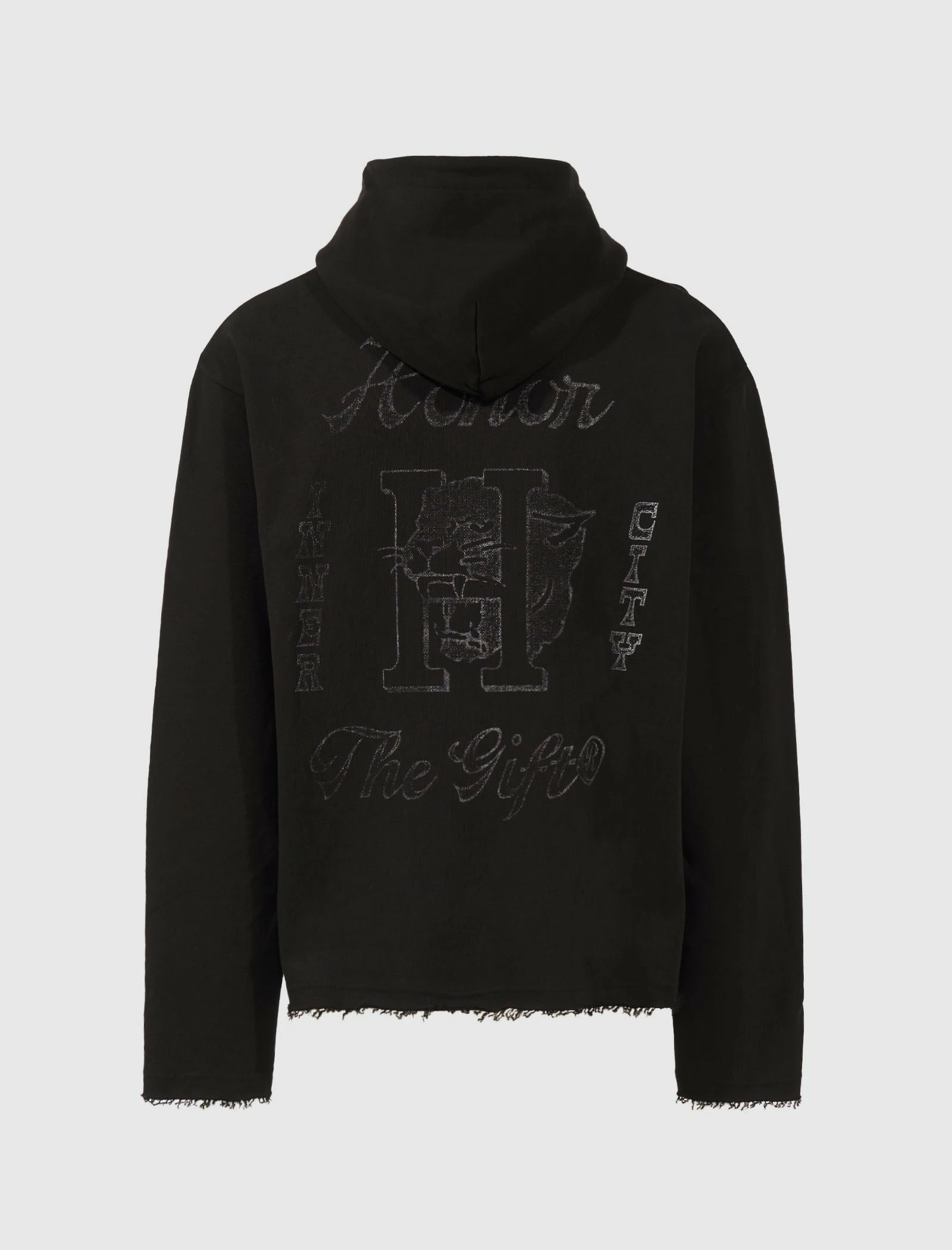 Pullover hoodie. Fixed hood. Graphic logo print and embroidered logo text at chest. Kangaroo pocket at front. Graphic logo text, text and logo print at back. – 100% Cotton SKU: HTG220360-BLK