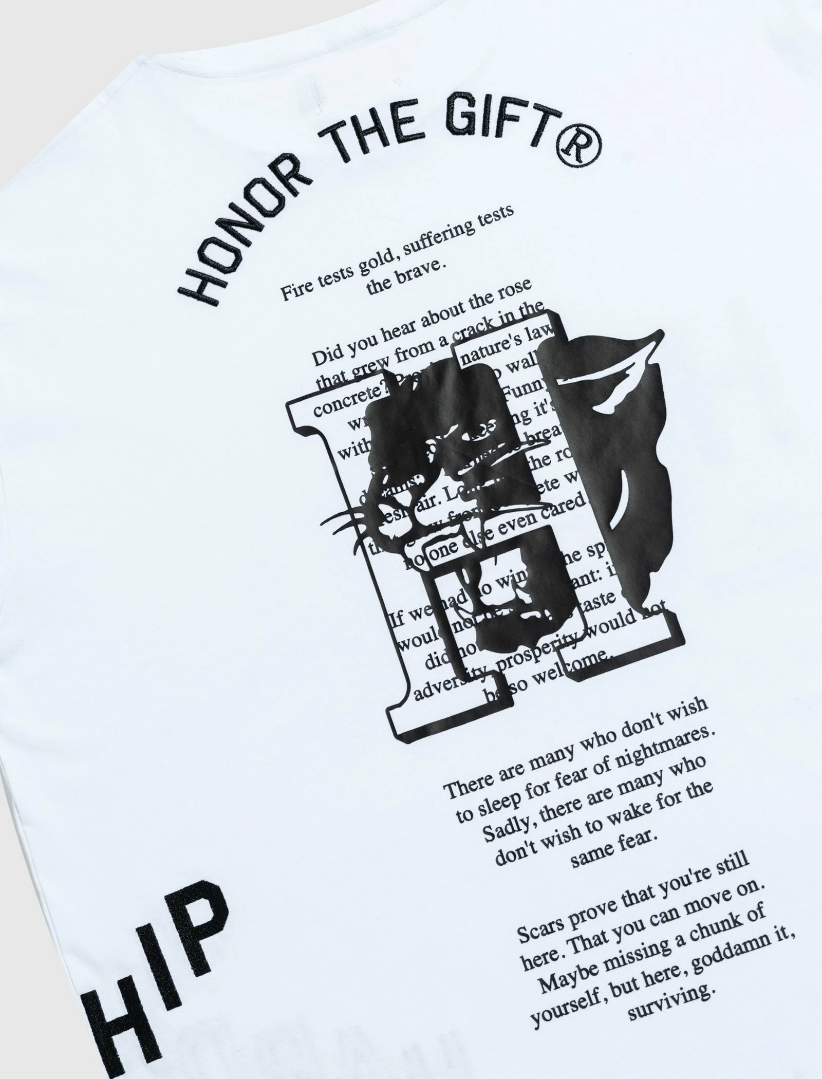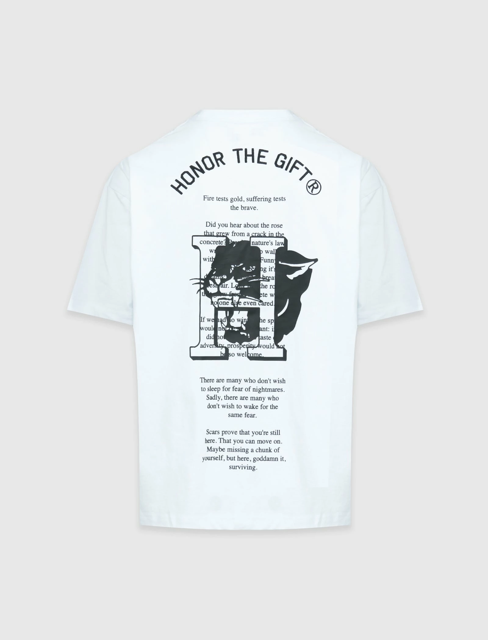 Short sleeve t-shirt. Crewneck collar. Printed graphics down the sides of the front. Large graphic printed on the back. – Cotton SKU: HTG220447-WHT