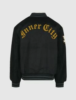 Wool-blend varsity jacket. Striped ribbed knit collar, cuffs and hem. Two pockets at sides. Logo text, graphics prints and text patches throughout. Two pockets at sides. Snap closures at front. – 74% Polyester, 26% Wool SKU: HTG220330
