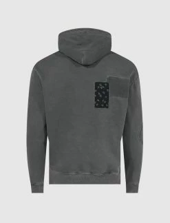 Pullover hoodie. Fixed hood. Embroidered text at chest. Kangaroo pocket at front. Patches at sleeve and back. Ribbed cuffs and hem. – 100% Cotton SKU: HTG210353-BLK