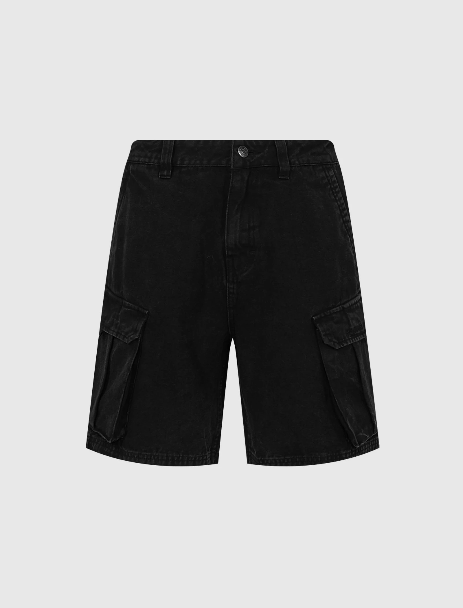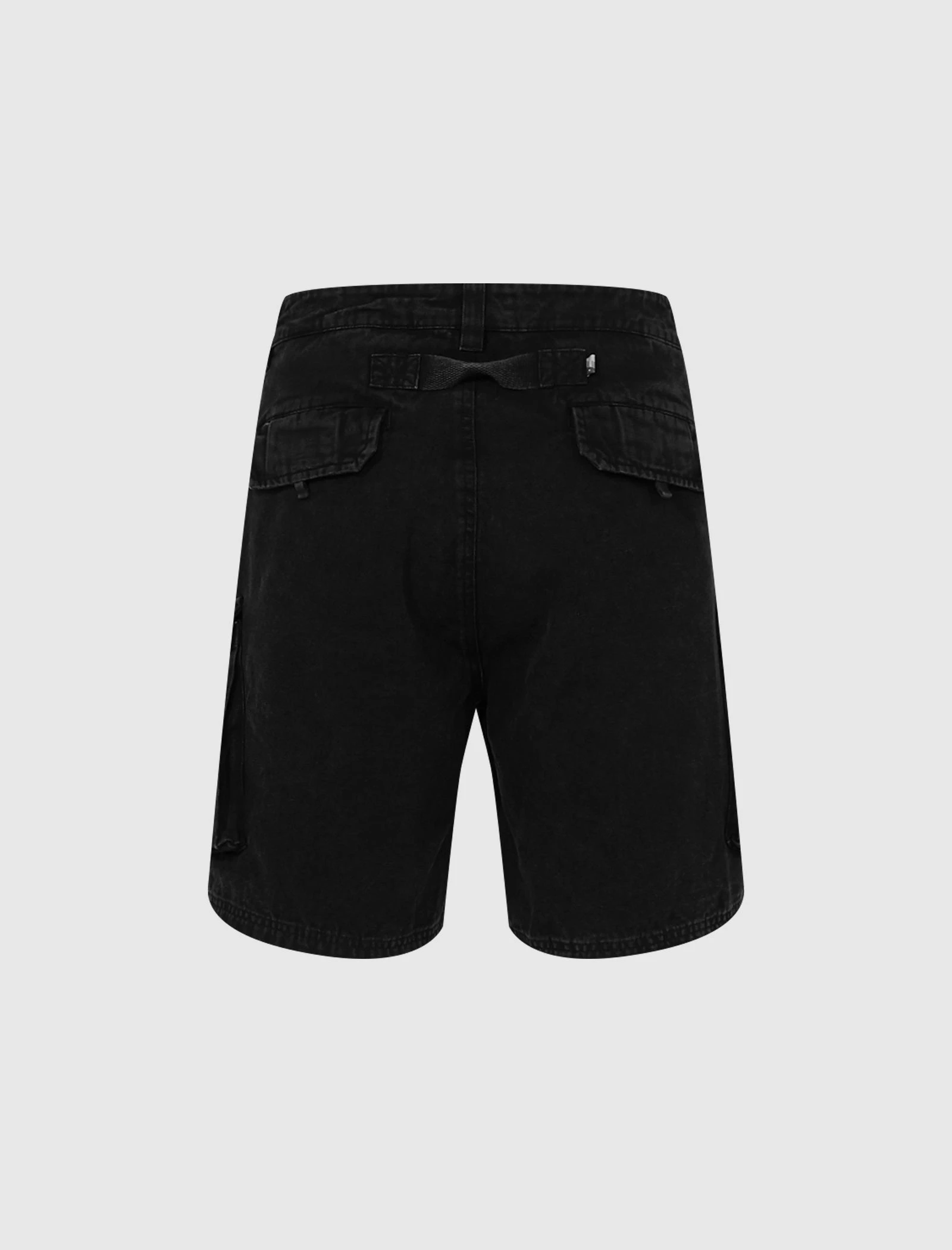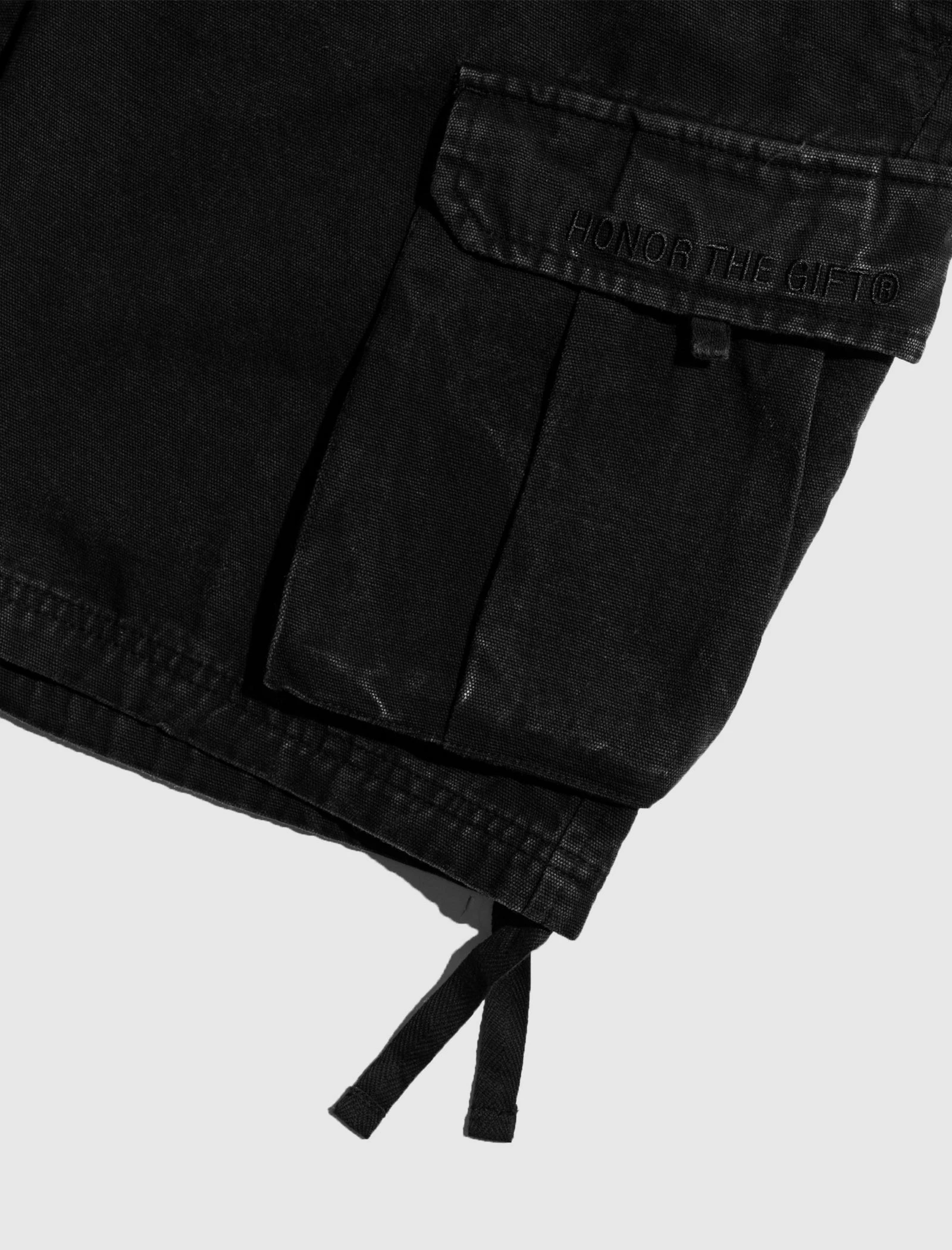 Two pockets at sides. Two camo cargo pockets at legs. Two flap pockets at back. Drawstrings at hems. Zip-fly closure at front. – Heavyweight Duck Canvas SKU: HTG200320-BLK