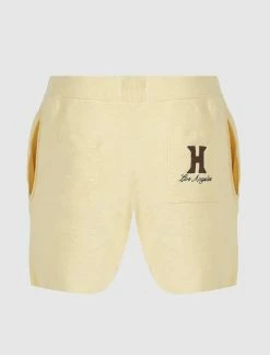 Knit shorts. Elasticized waistband. Two pockets at sides. Single pocket featuring logo print and text at back. Embroidered logo print above hem. – 78% Tencel, 22% Cotton SKU: WHTG220120-BLONDE