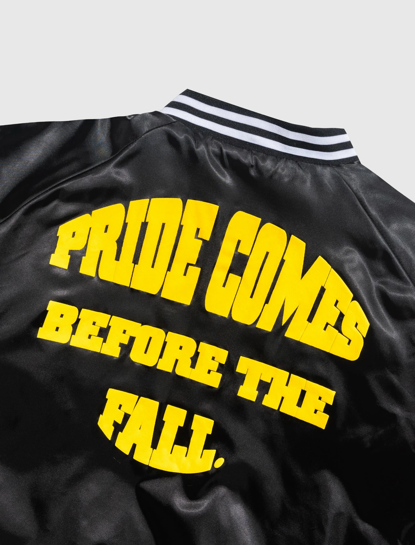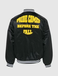 Satin bomber jacket. Striped ribbed knit collar, cuffs and hem. Embroidered patches at chest. Embroidered text at back. Two pockets at sides. Snap closures at front. – 100% Nylon SKU: HOH-CC-VARSITY-BLKXWHT
