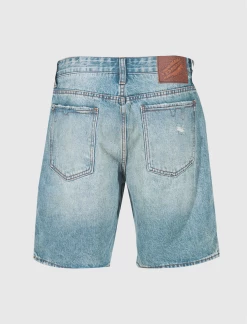 Medium wash denim shorts. Five-pockets. Contrast stitching throughout. Distressed detail featuring logo text at front. Button-fly closure at front. – 100% Cotton SKU: 421-4102-GELATTO