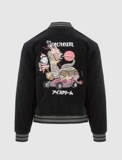 Velour souvenir jacket. Ribbed knit collar, cuffs and hem. Embroidered print patches at chest. Two pockets at sides. Embroidered logo text and prints at back. Zip closure at front. – 100% Polyester SKU: 421-6402-BLK
