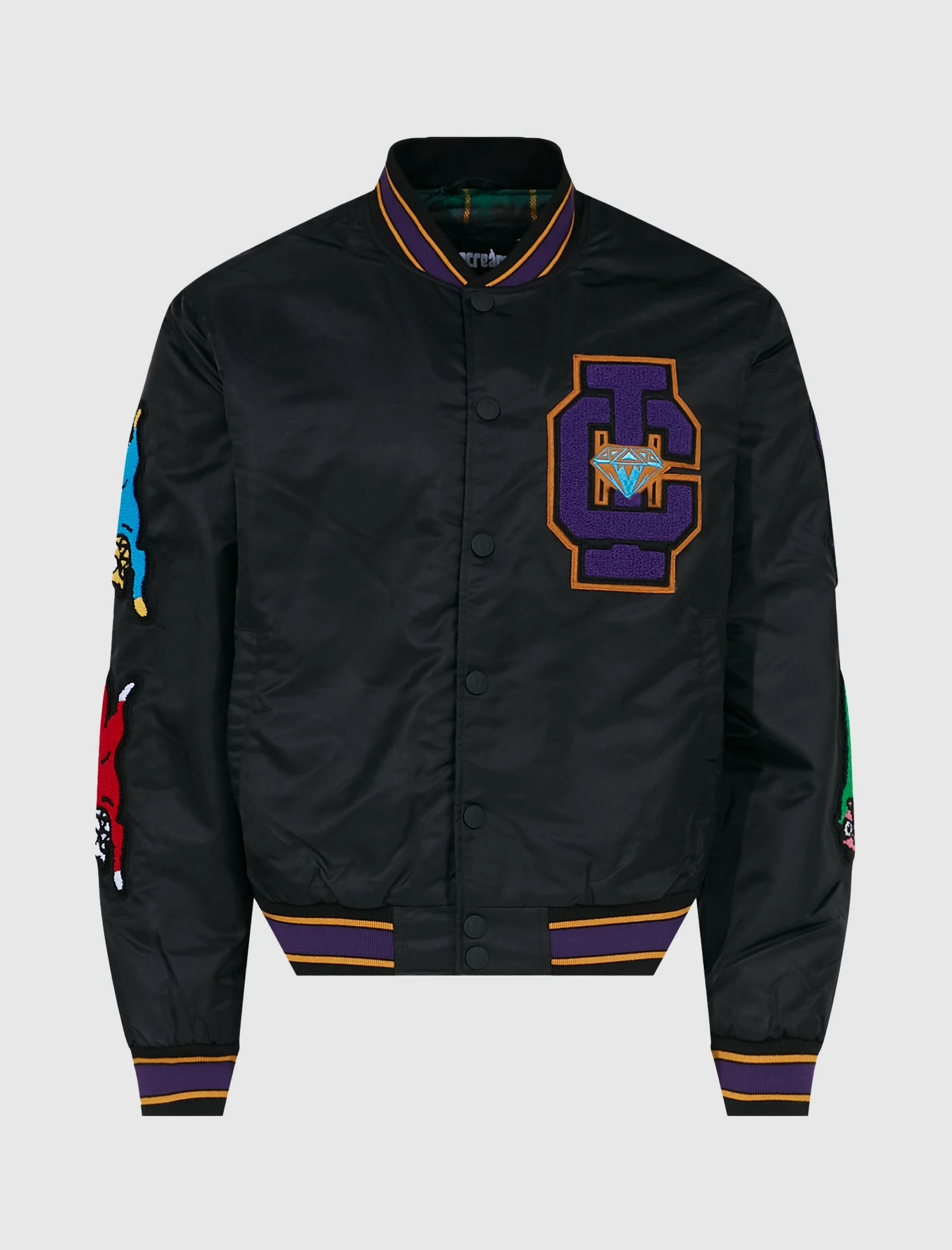 Nylon varsity jacket. Striped ribbed collar, cuffs and hem. Patches at chest and sleeve. Logo text patch at back. Two pockets at sides. Snap closures at front. – 100% Nylon SKU: 411-7401