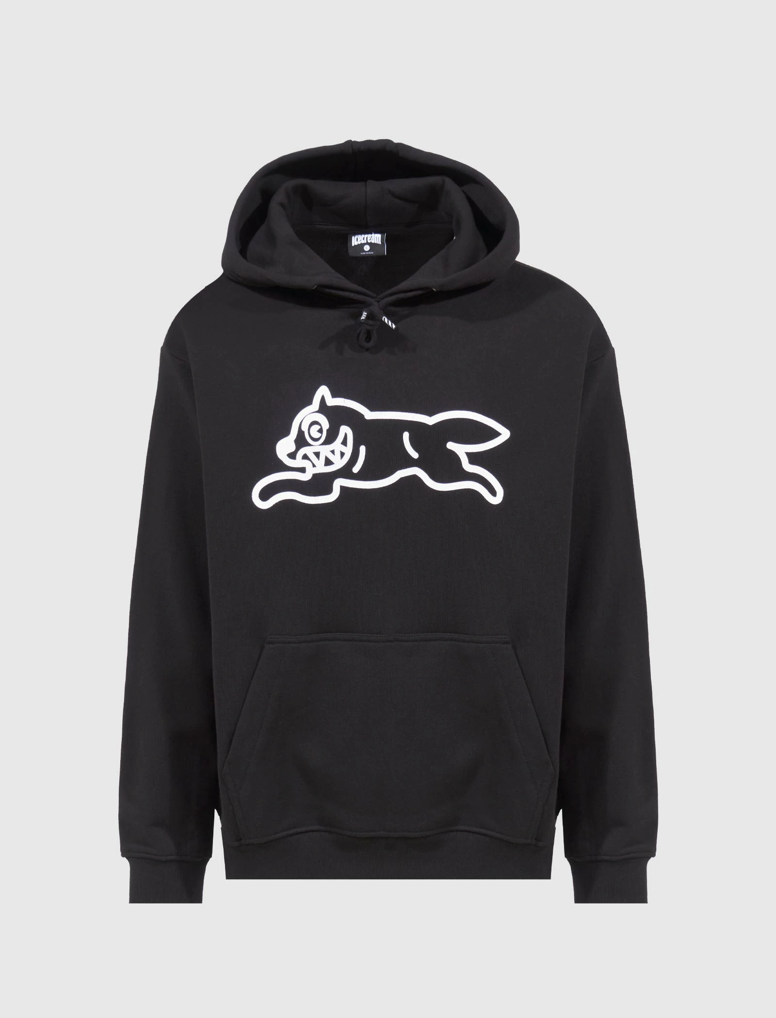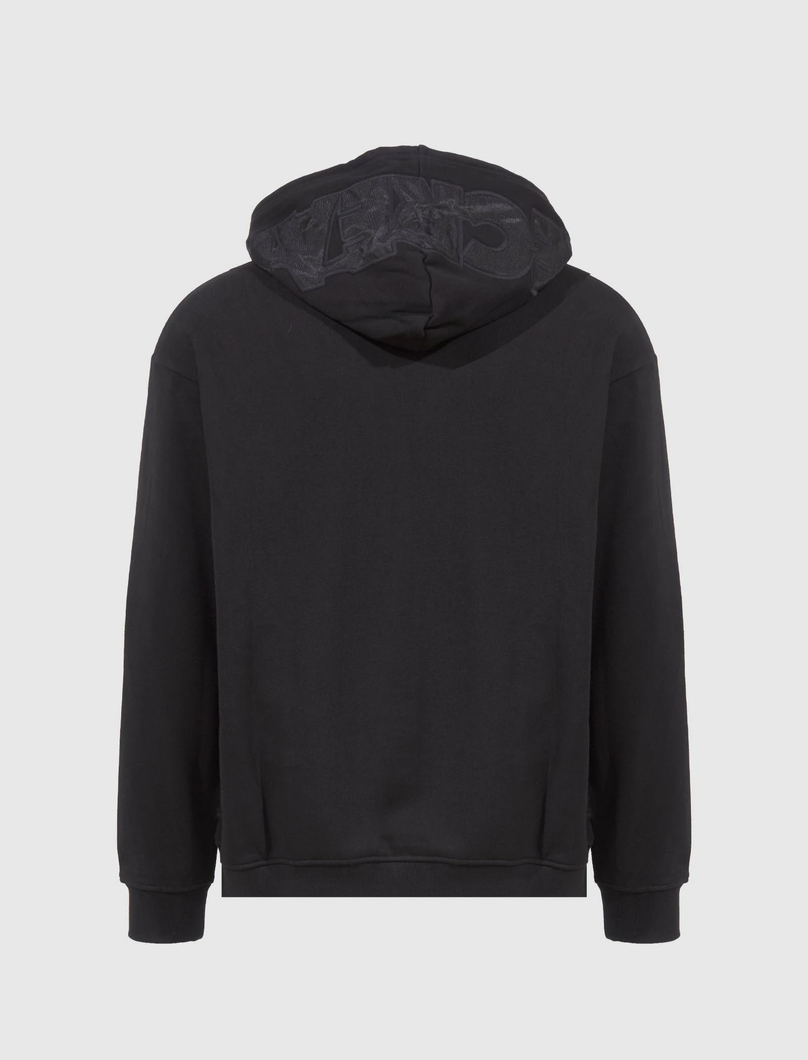 Pullover cotton hoodie. Adjustable drawstring hood featuring logo text patch. Graphic logo print at chest. Kangaroo pocket at front. Ribbed cuffs and hem. – 100% Cotton SKU: 421-6306-BLK