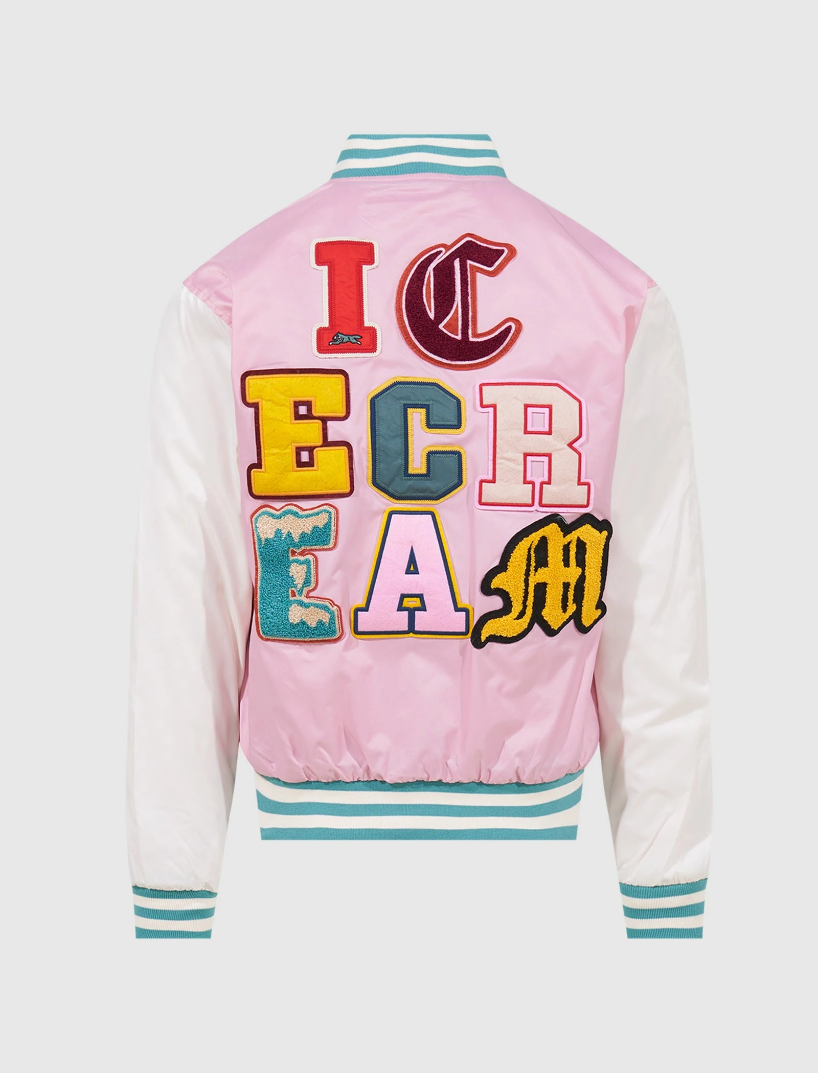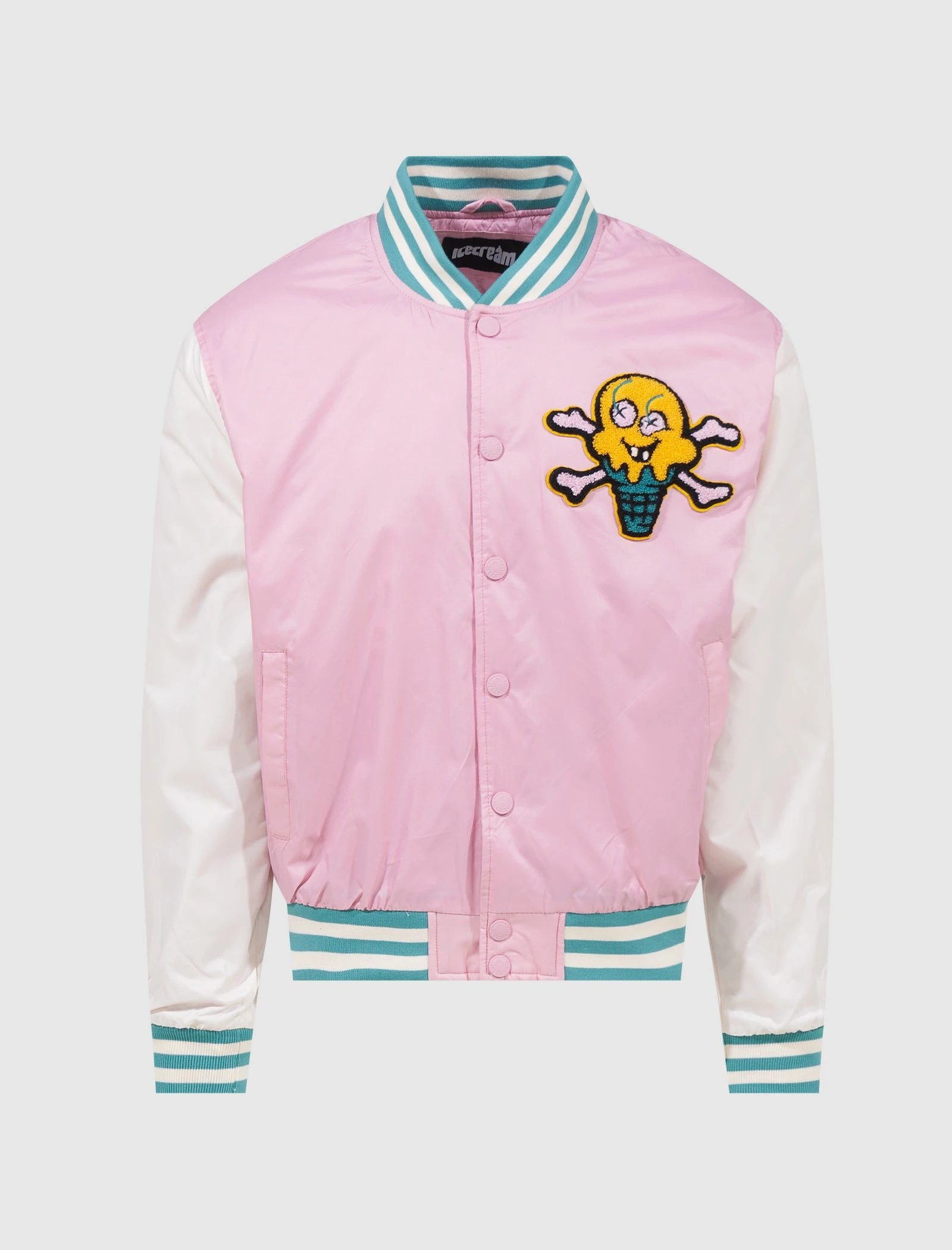 Varsity jacket. Striped ribbed knit collar, cuffs and hem. Logo print patch at chest. Logo text at back. Two pockets at sides. Snap closure at front. – 100% Nylon SKU: 421-2400