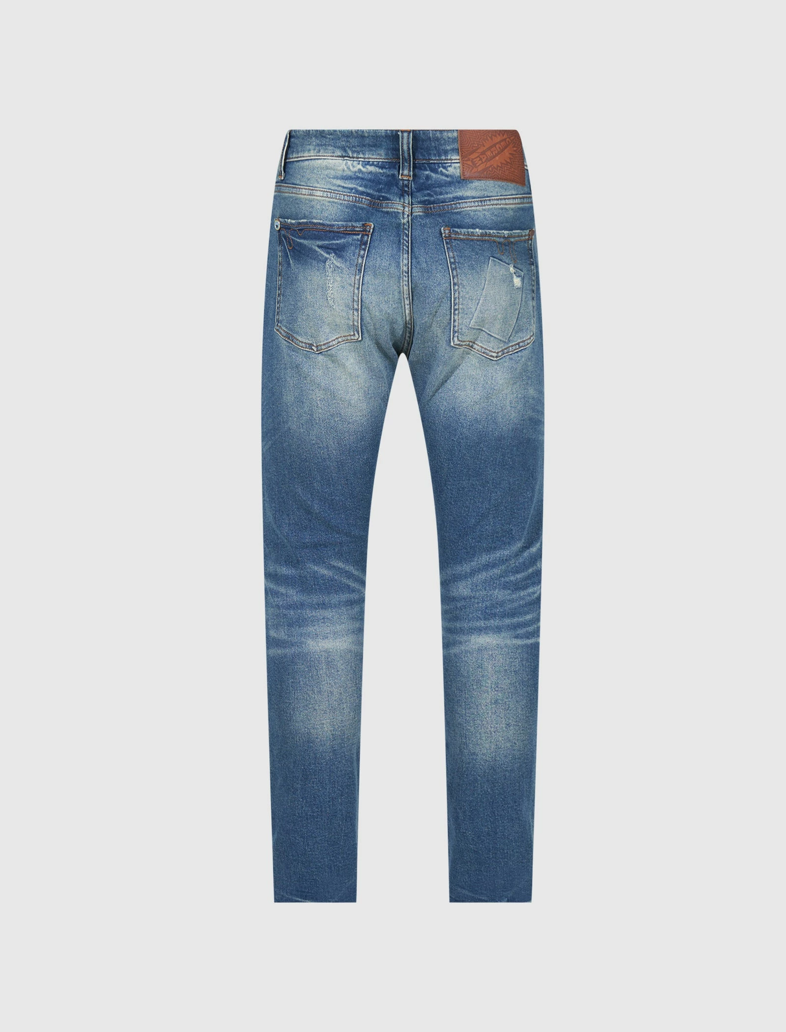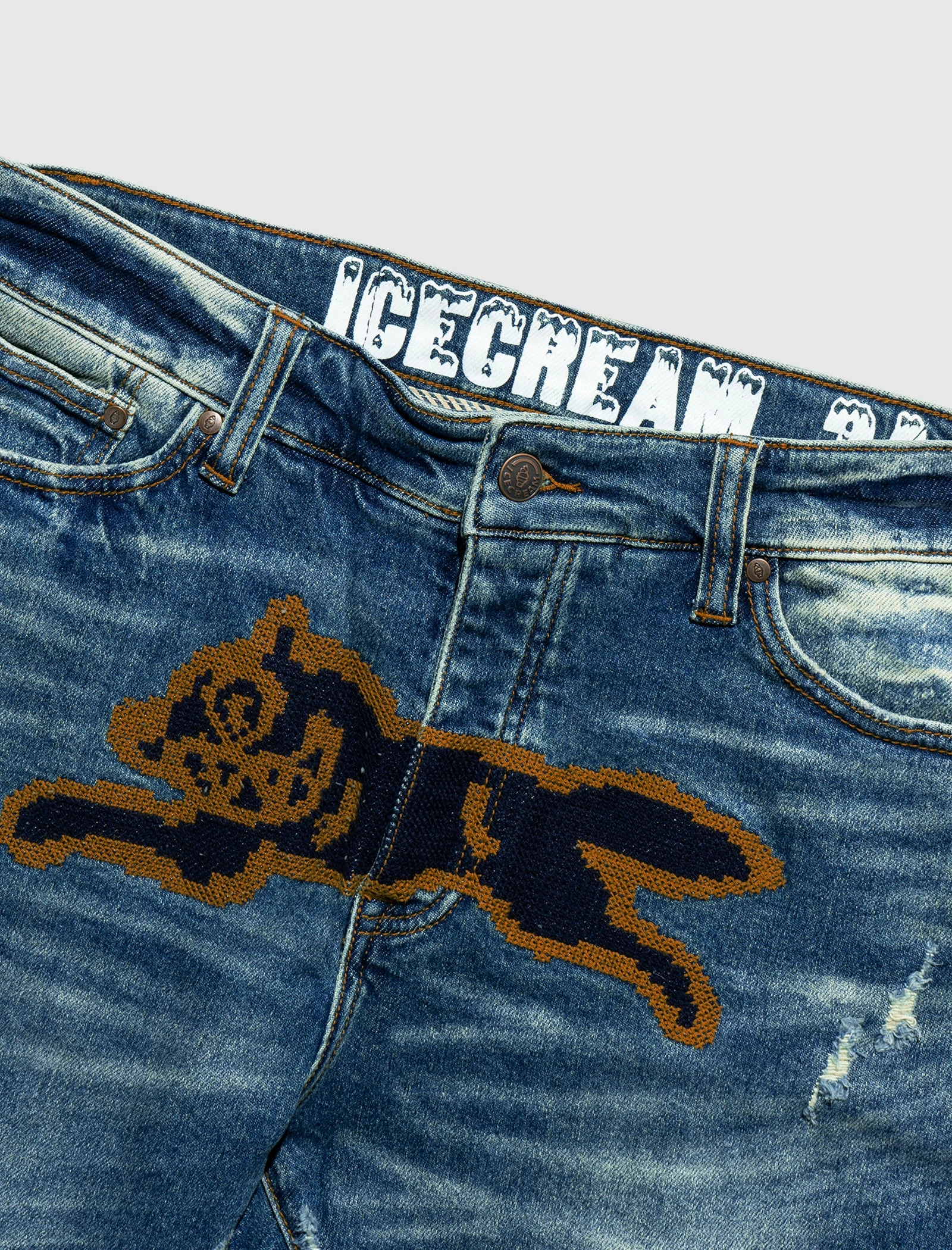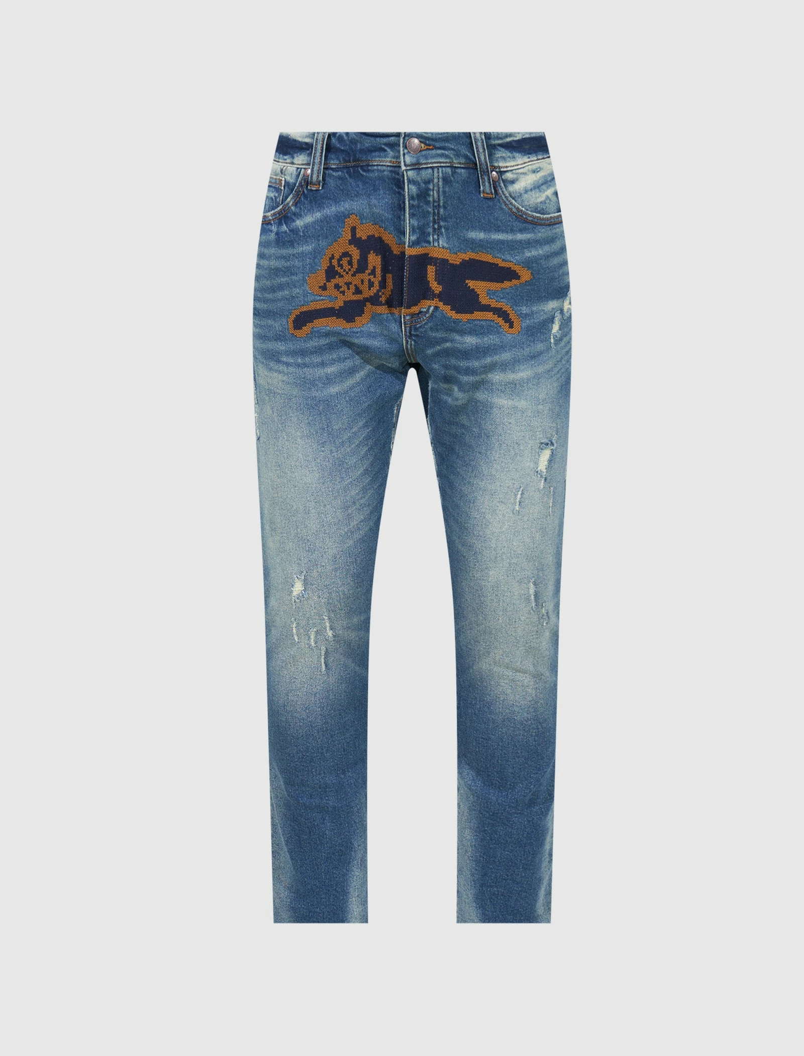 Light-wash denim jeans. Five-pockets. Graphic logo print at front. Distressed detail at front. 99% Cotton, 1% Elastane SKU: 421-2100