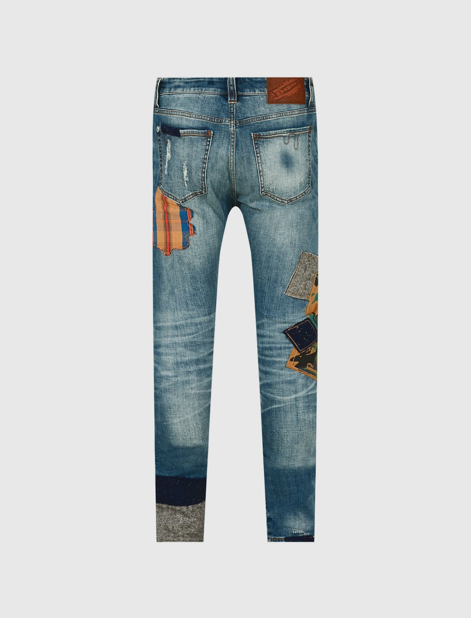 Denim. 5 pocket construction. 2 side pockets. Coin pocket in the right pocket. 2 patch pockets on the back. Printed graphic on the front. Whiskering and fading on the front and back. Distressing details throughout. Patch repairs throughout. Belt loops at the waistband. Leather back patch. Button fly. – 98% Cotton, 2% Elastane SKU: 411-8104