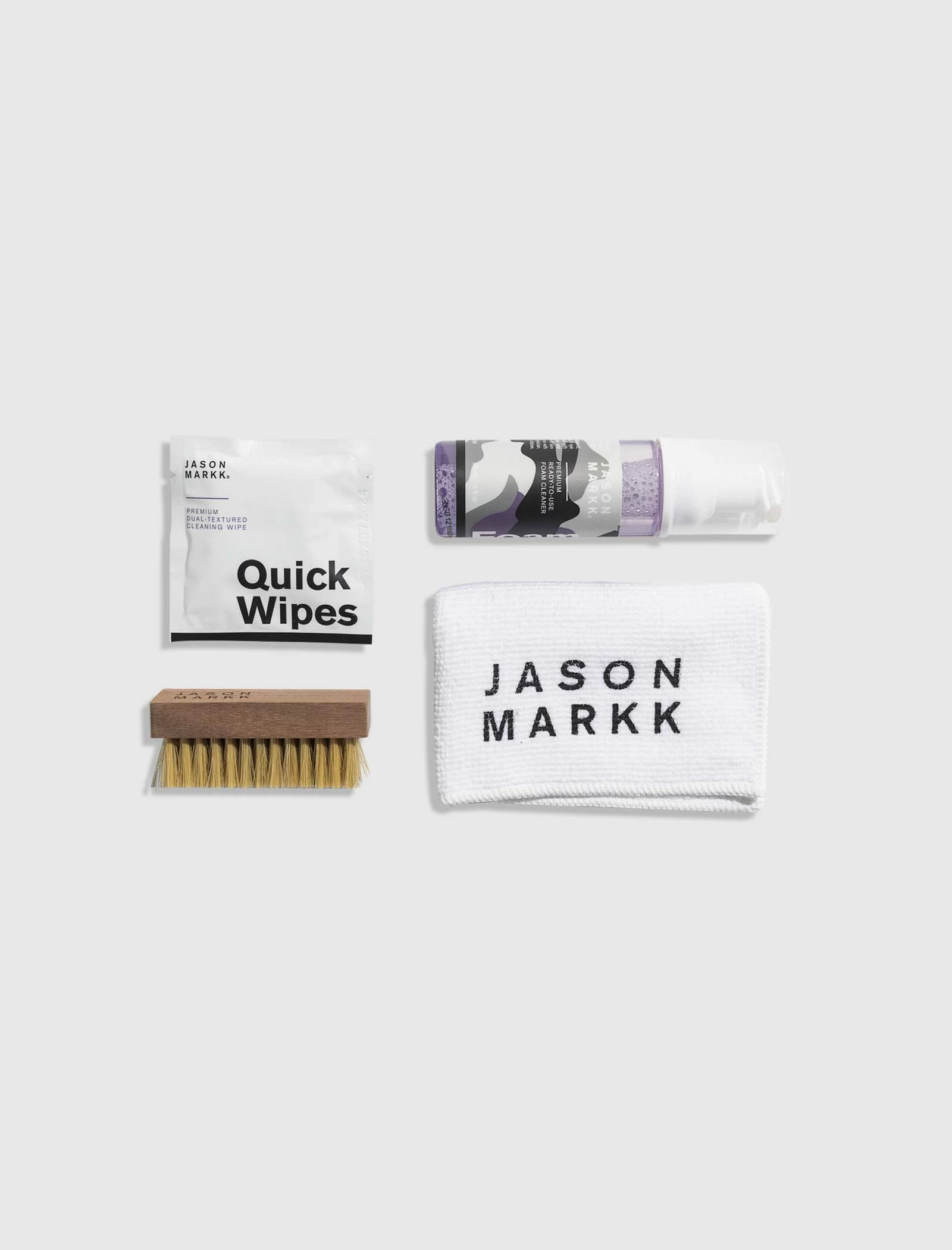 Shoe cleaning kit. Includes a 2 oz. RTU foam cleanser, a mini premium cleaning brush, a microfiber towel, and 3 quick wipes. Packaged inside a nylon ripstop zippered case with a transparent front. – Shoe cleaning kit SKU: JASON-MARKK-FIELD-KIT