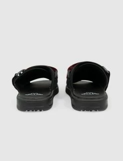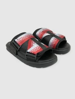 Slides. Nylon strap upper. Nylon tape adjustable strap on the upper with graphic branding on top. Velcro closure on the outer side panel. Foam footbed. Rubber sole. – Nylon SKU: 341B6FW-A00-BLKXLTRED