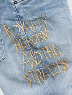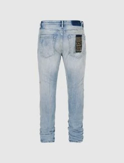 Light wash skinny denim jeans. Five-pockets. Gold-tone hardware. Gold-tone embroidery throughout. Distressed details at front. Button-fly closure at front. – 98% Cotton, 2% Elastane SKU: MRHC22DJ04