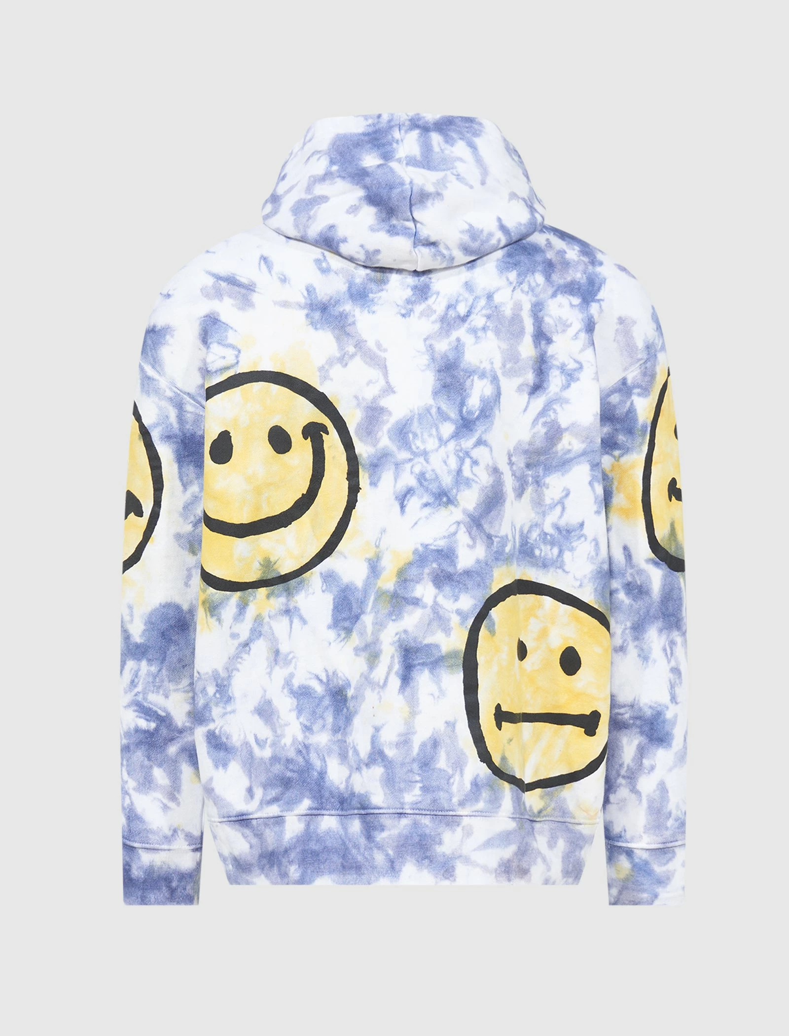 Pullover hoodie. Adjustable drawstring hood. Tie-dye print throughout. Smiley face print throughout. Kangaroo pocket at front. Ribbed cuffs and hem. – 100% Cotton SKU: 397000310