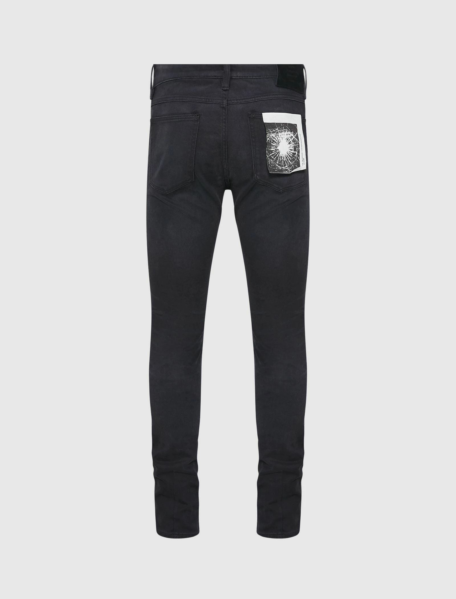 Denim jeans. Tapered fit. 2 side pockets. One coin pocket. 2 back pockets. 5 belt loops on the waistband. Button fly. Metal rivets. Distressed knee openings. Suede logo patch on the back. – Cotton SKU: 34190