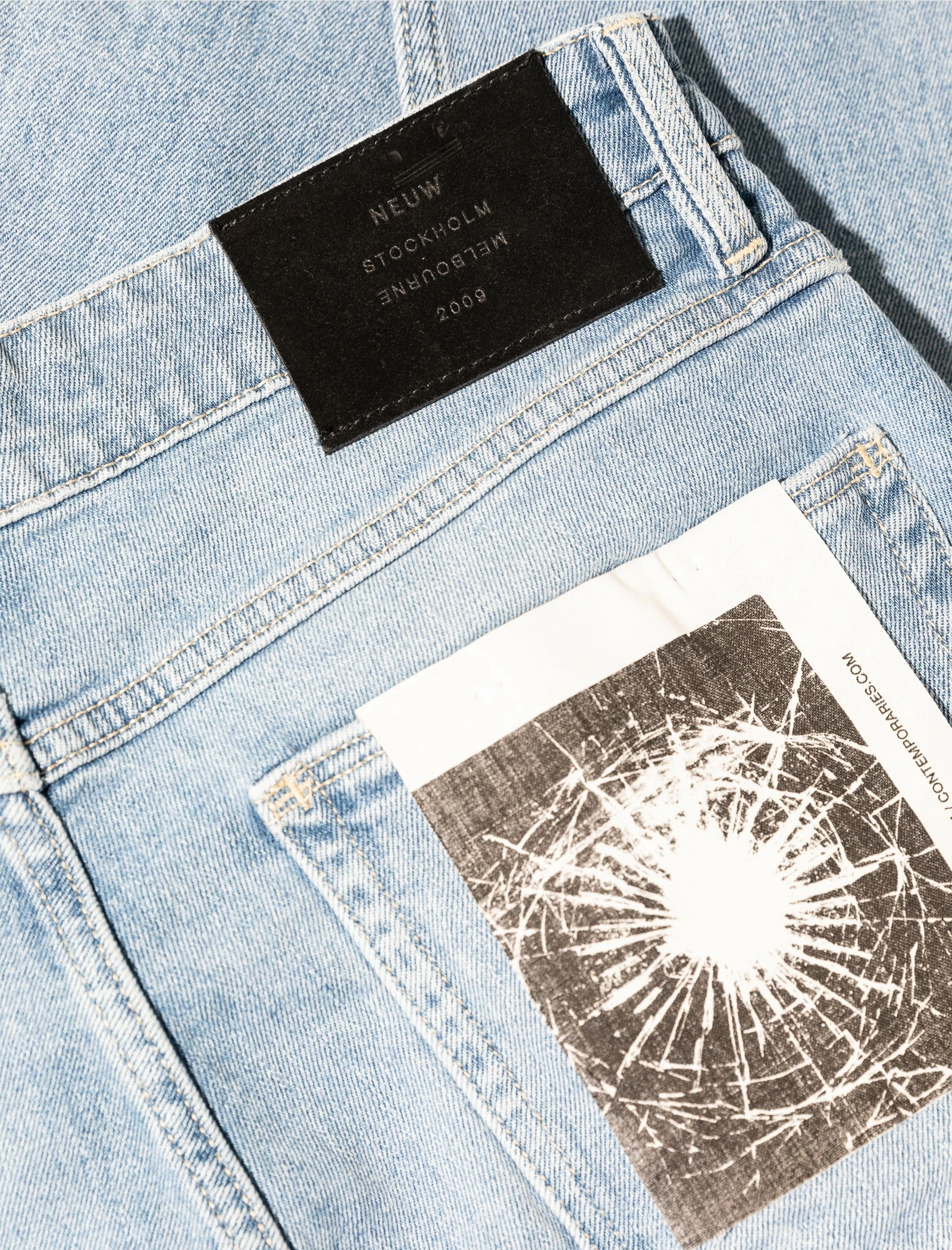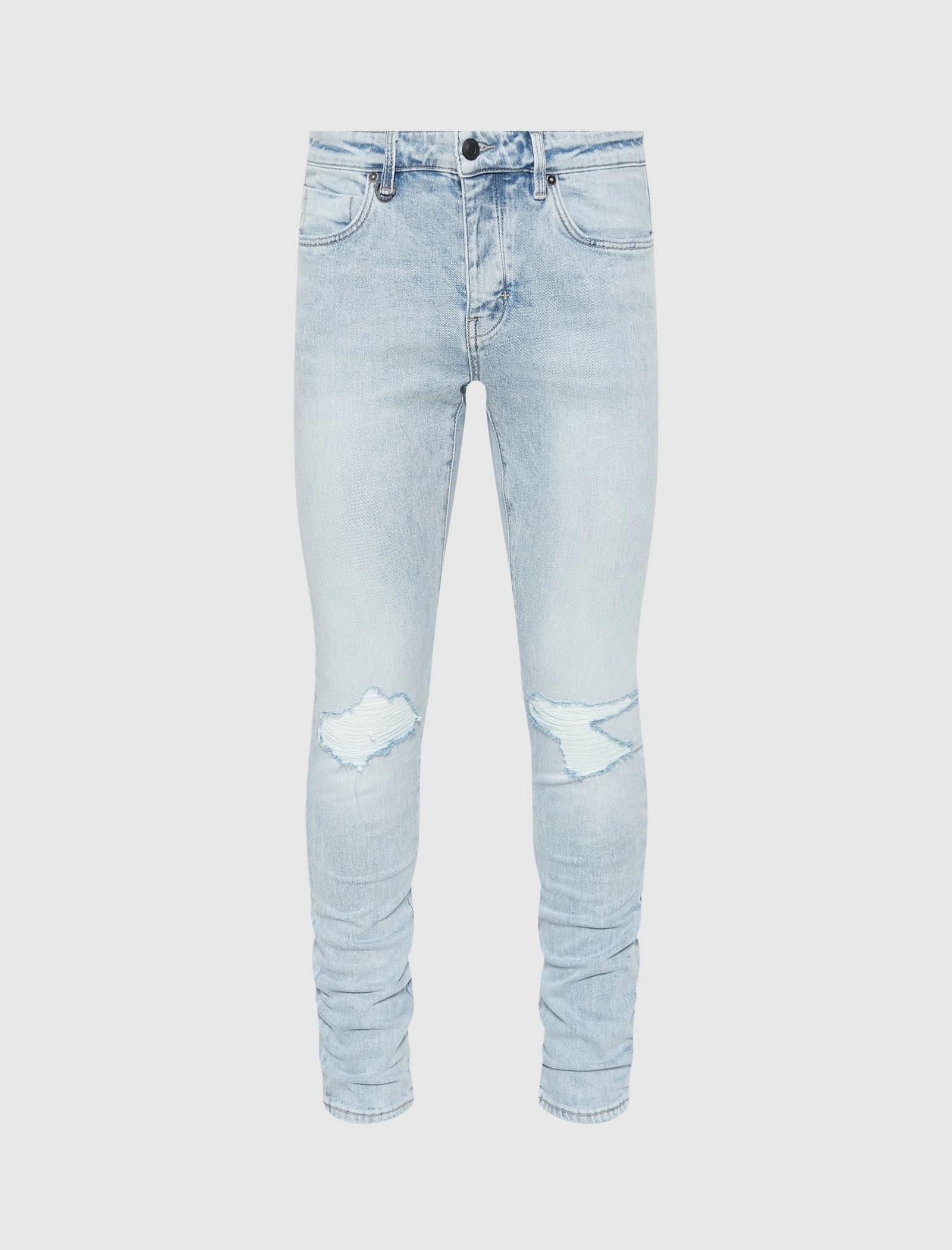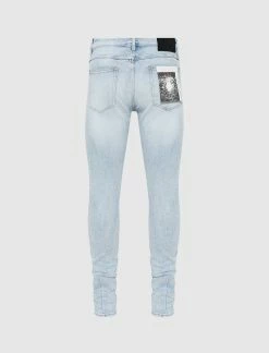 Denim jeans. Tapered fit. 2 side pockets. One coin pocket. 2 back pockets. 5 belt loops on the waistband. Button fly. Metal rivets. Suede logo patch on the back. Light wash, pre-faded fabric. Distressed knees. Pleat behind both hems. – Cotton SKU: 34194B