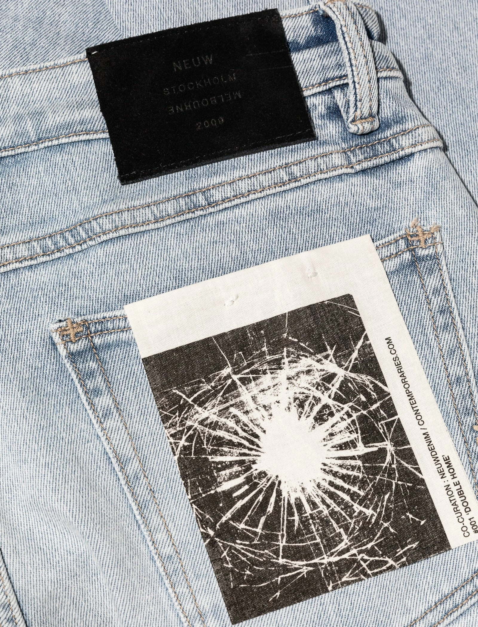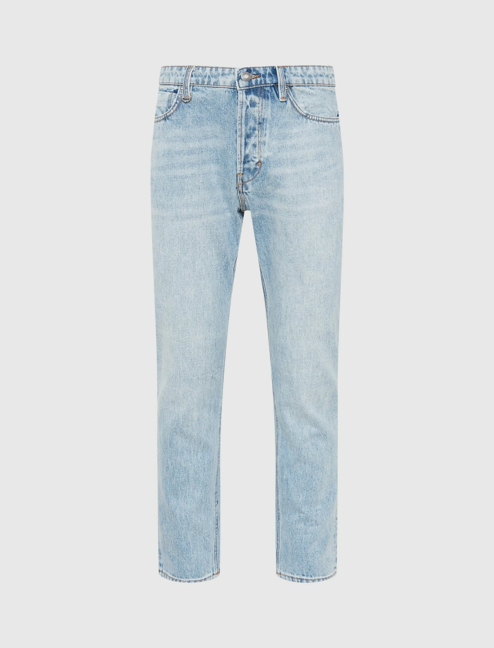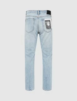 Denim jeans. Straight fit. 2 side pockets. One coin pocket. 2 back pockets. 5 belt loops on the waistband. Button fly. Metal rivets. Suede logo patch on the back. Light wash, pre-faded fabric. Pleat behind both hems. – Cotton SKU: 34003