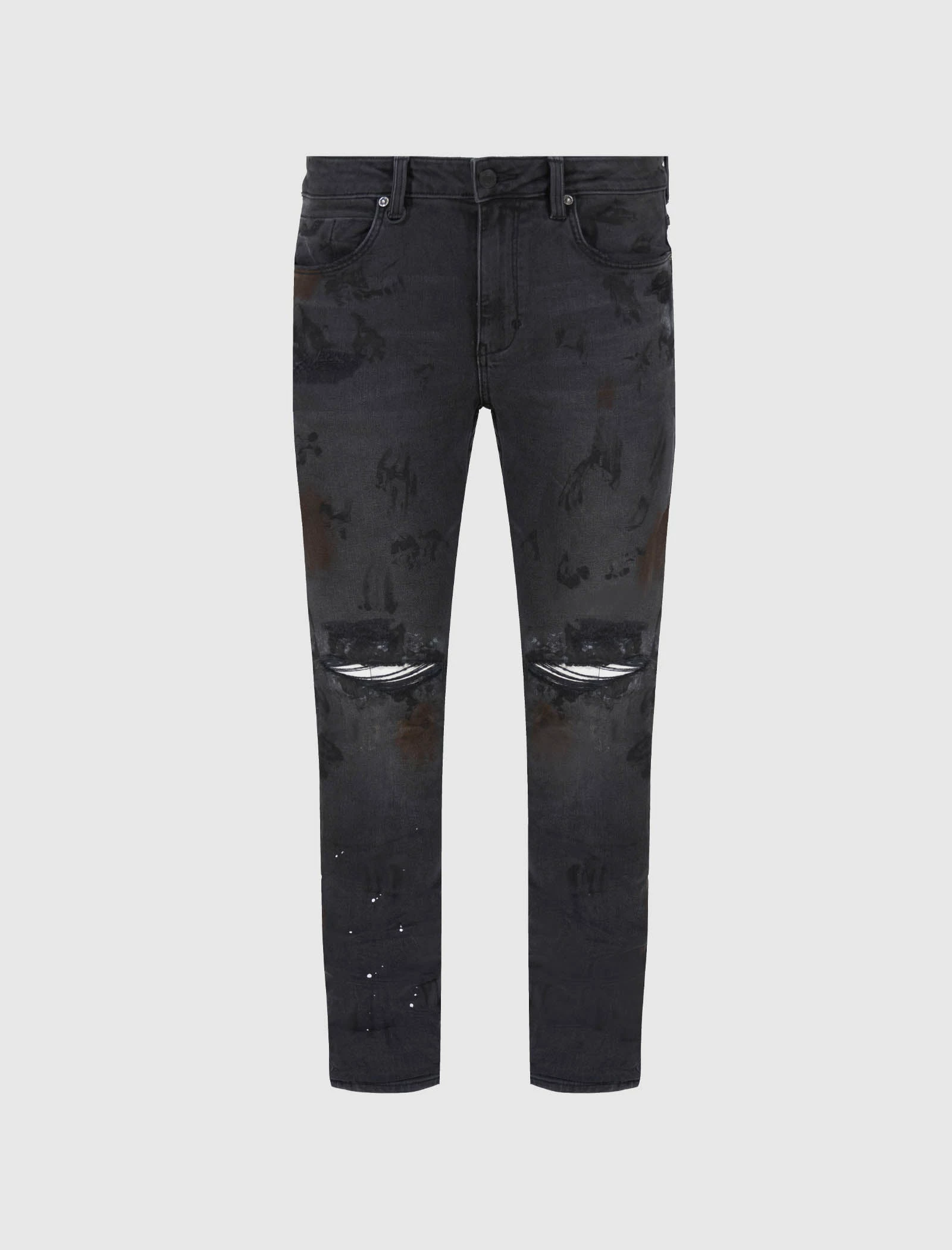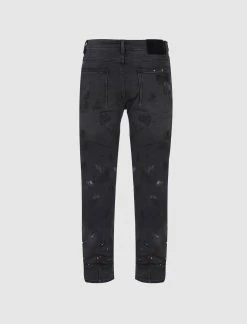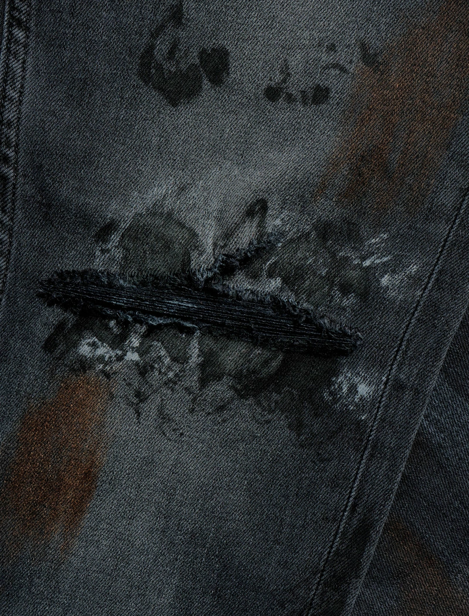 Cotton-blend denim jeans. Five-pockets. Distressed detail at knees. Splattered paint and faded detail throughout. Zip-fly closure at front. – 98% Organic Cotton, 2% Elastane SKU: 34440B