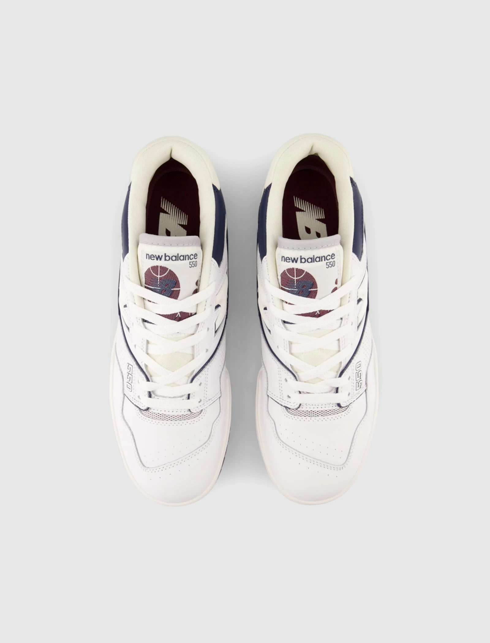 Low top sneakers. Leather overlays around the toe, and heel counter. Leather toe box, and side panels. Perforated leather side panel overlays. Stitched leather logo on the side panels. Polyester tongue. Front lacing. Padded polyester collar. Synthetic inserts around the heel counter. Rubber midsole. Rubber outsole. – Leather SKU: BB550PWB