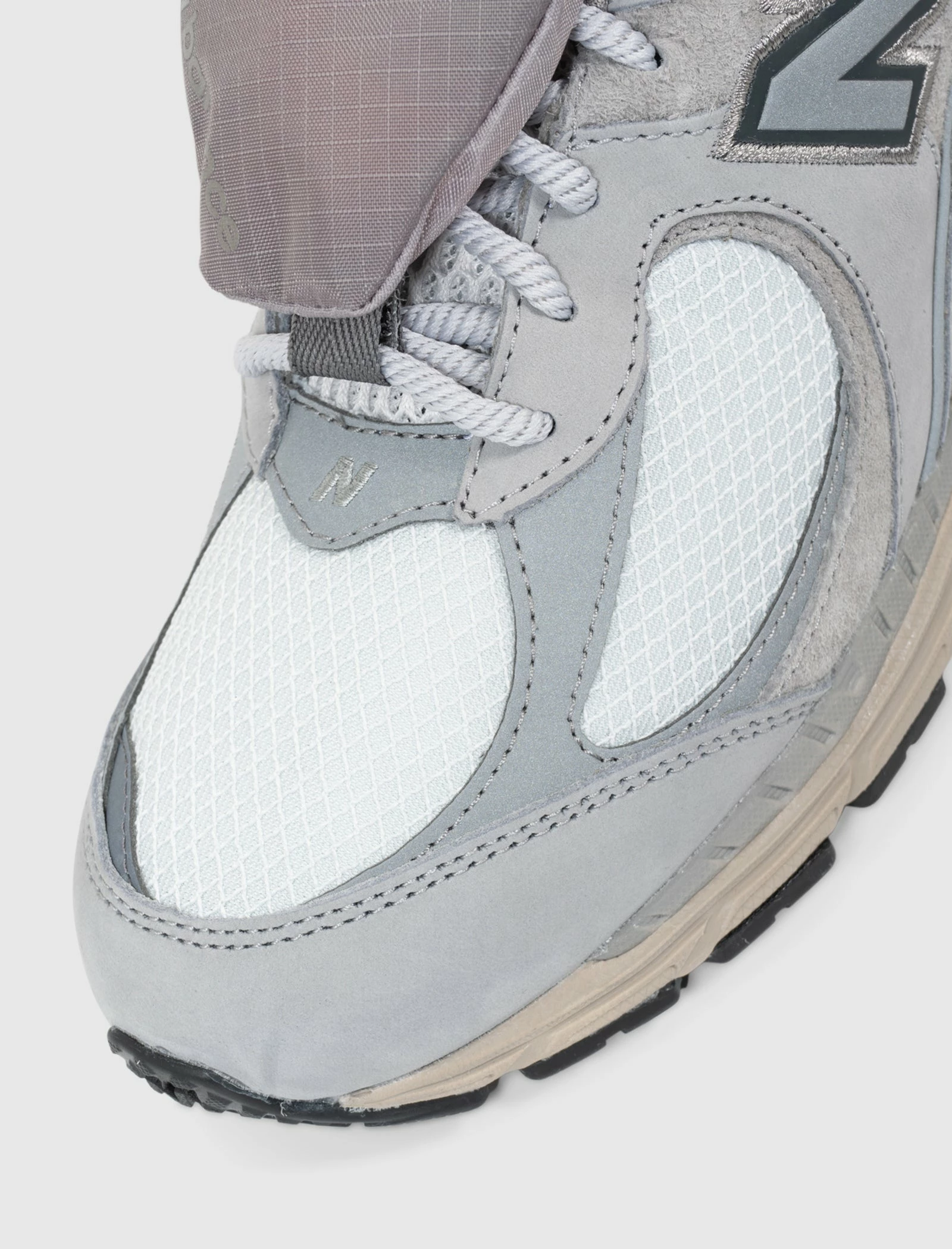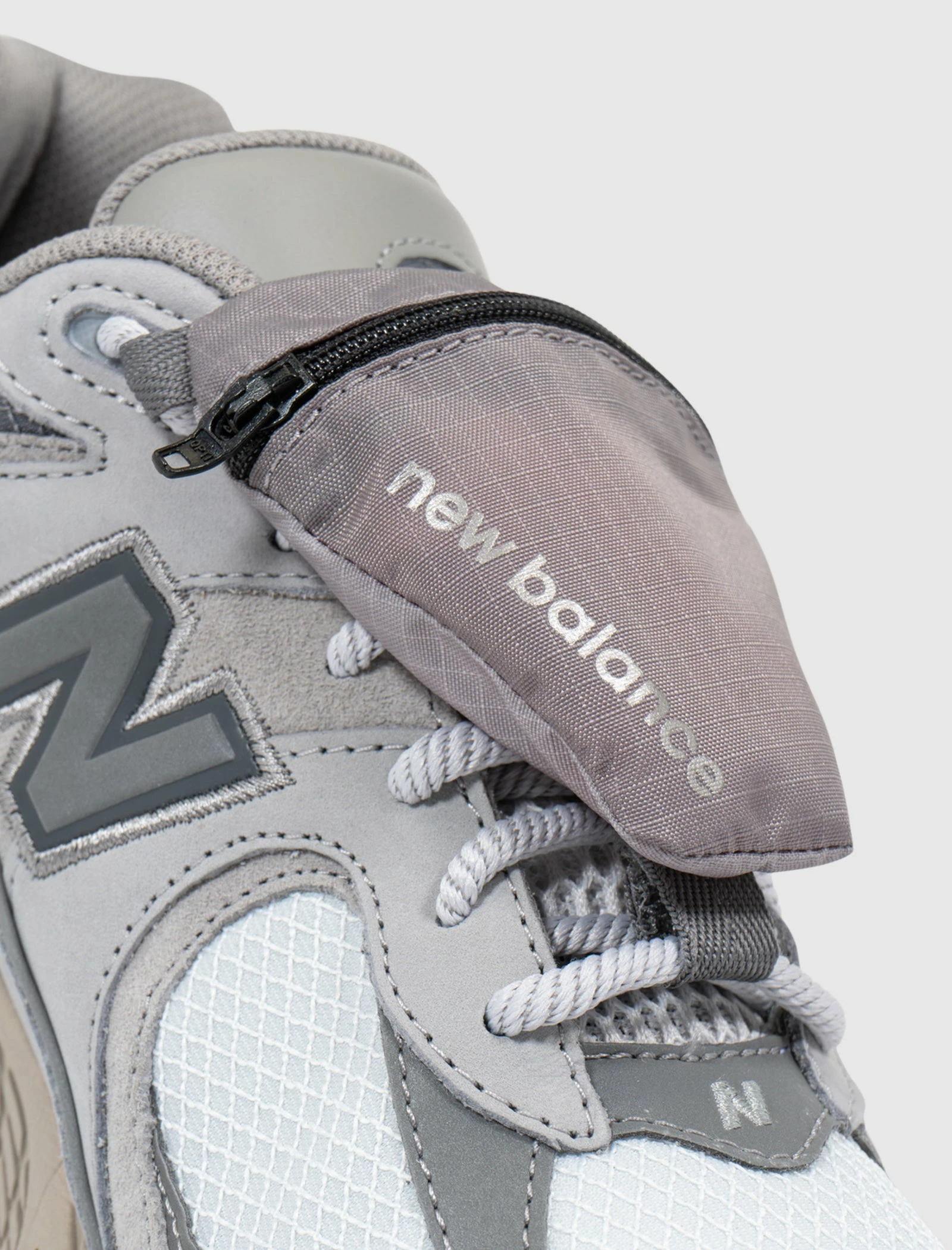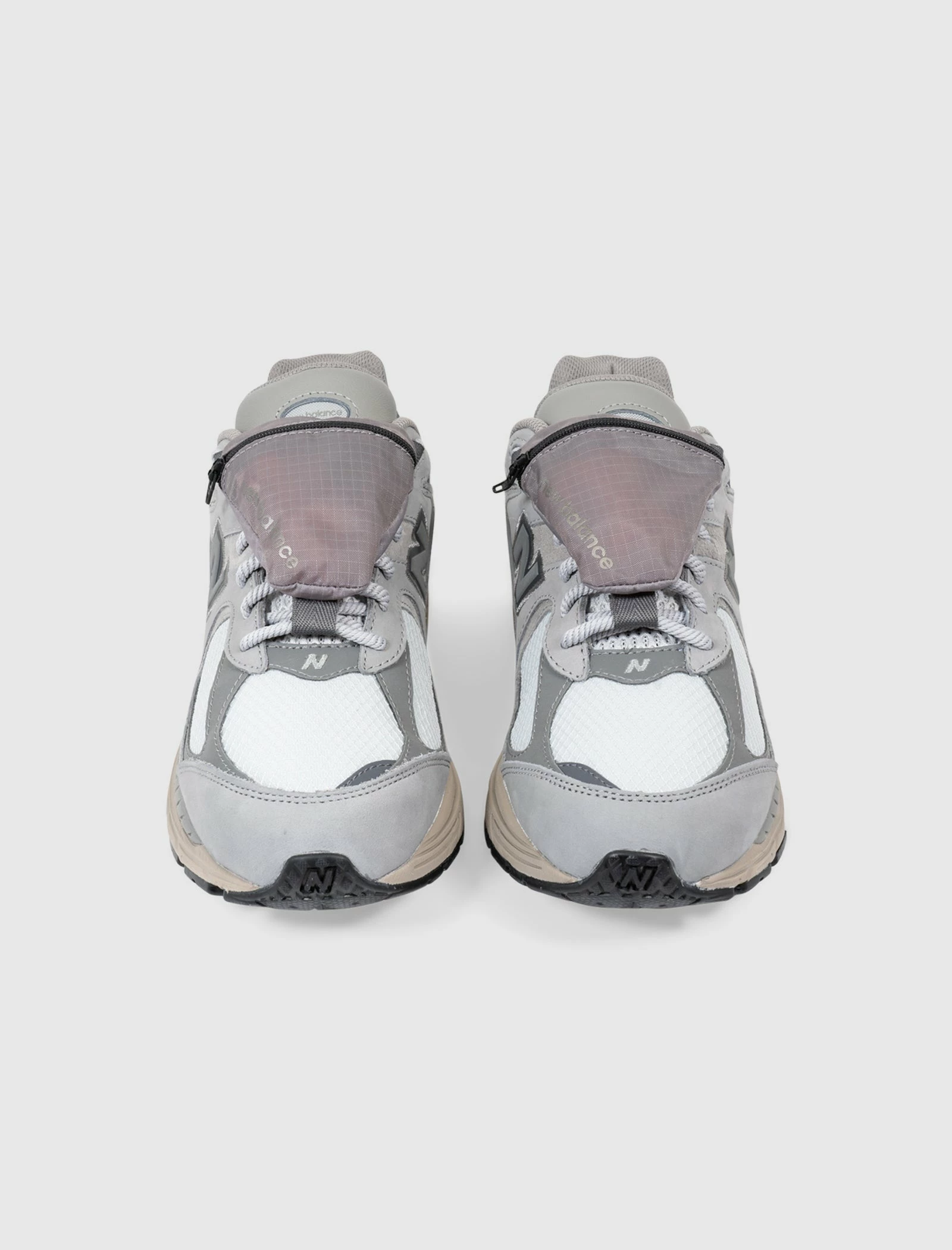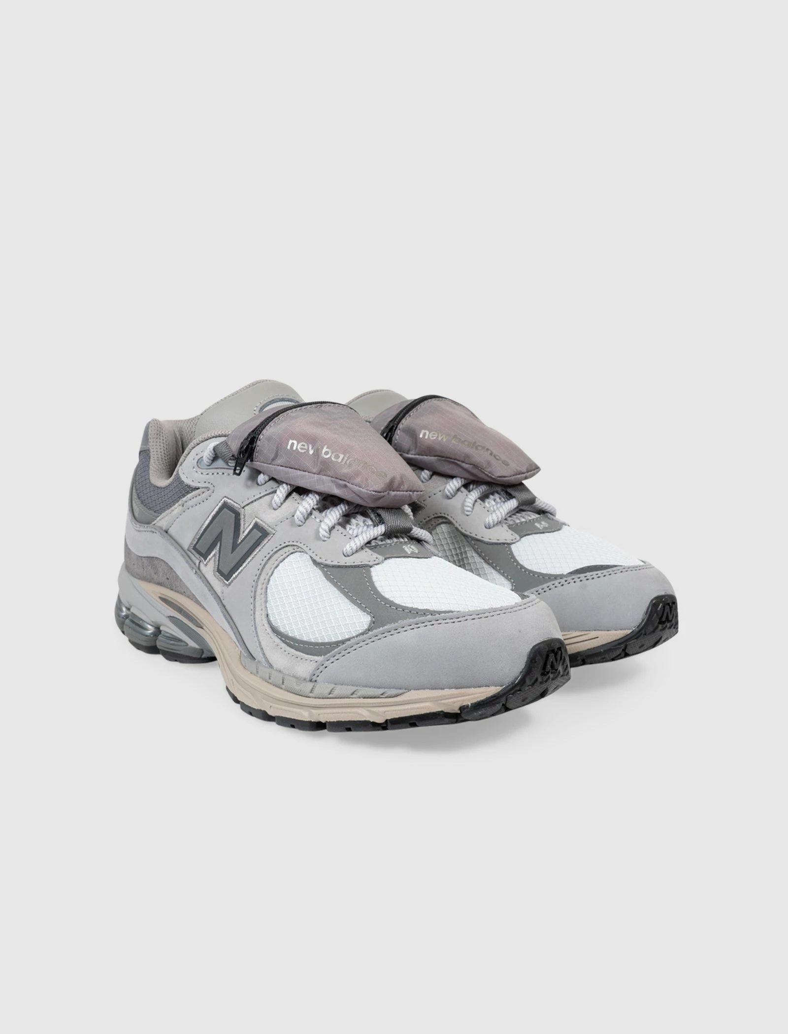 Low top sneakers. Suede overlays around the toe, side panels, and heel counter. Reflective accents on the front, and heel. Reflective logos on the side panels. Front lacing. Nylon mesh tongue, toe box, and collar. Nylon detachable pouch. Foam midsole with Nergy cushioning. Rubber outsole. – Suede, and nylon upper SKU: M2002RVC