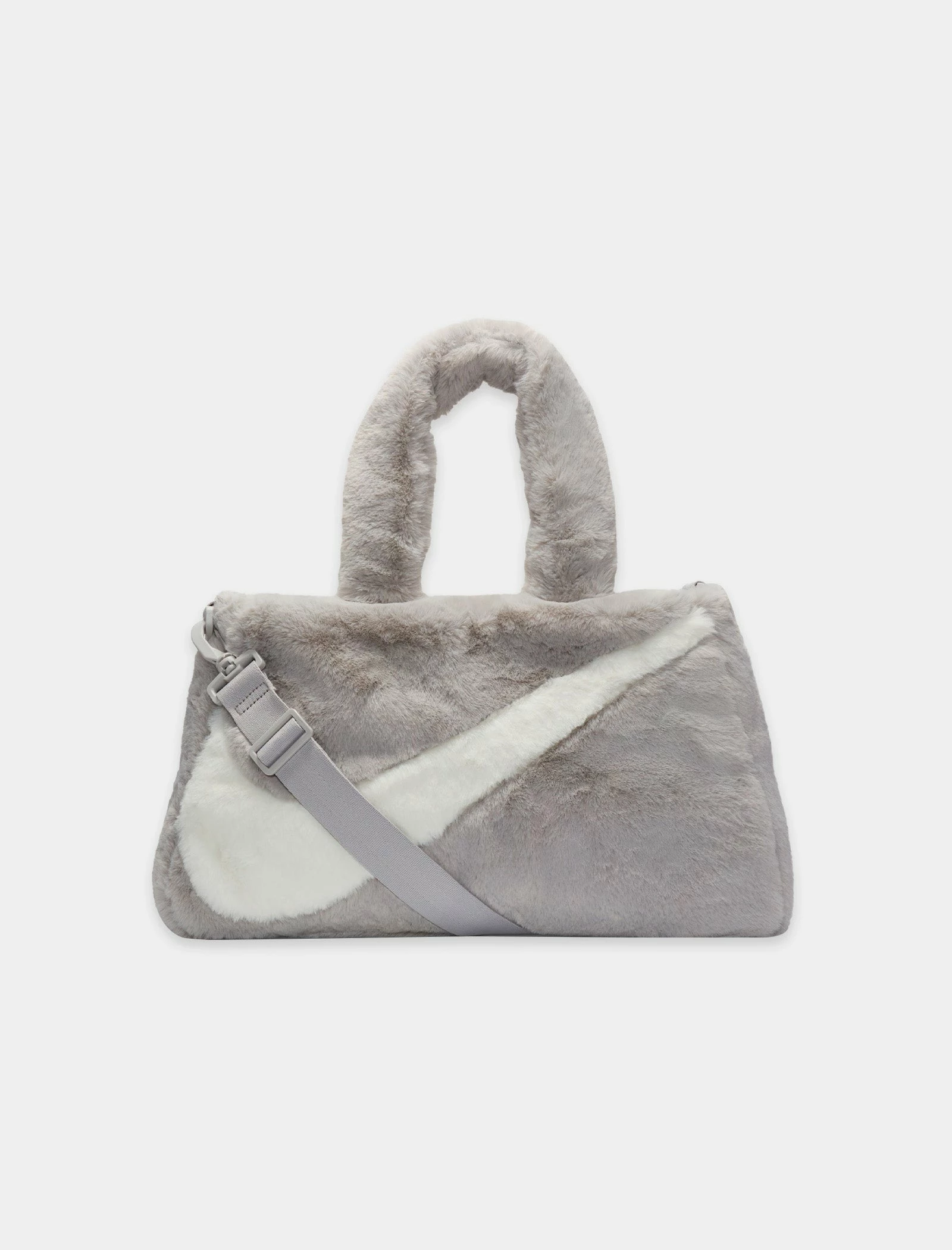 Faux fur tote bag. Faux fur logo on the front. 2 faux fur top handles. Nylon inner lining. Snap button closure. Zippered pocket inside the top compartment. Removable nylon shoulder strap. Plastic hardware. – 100% Polyester, 100% Nylon SKU: DQ5804-012