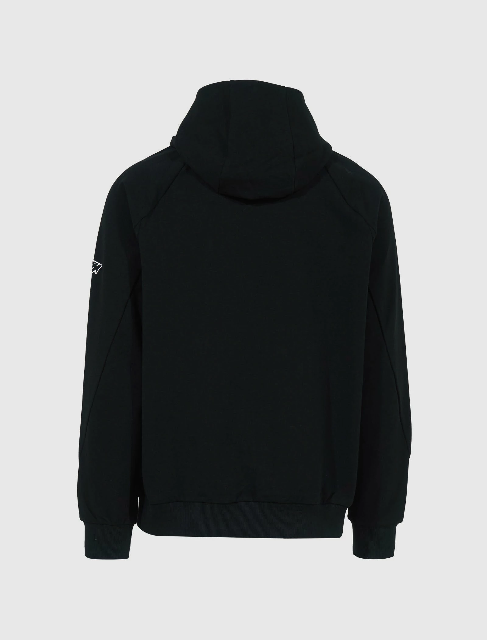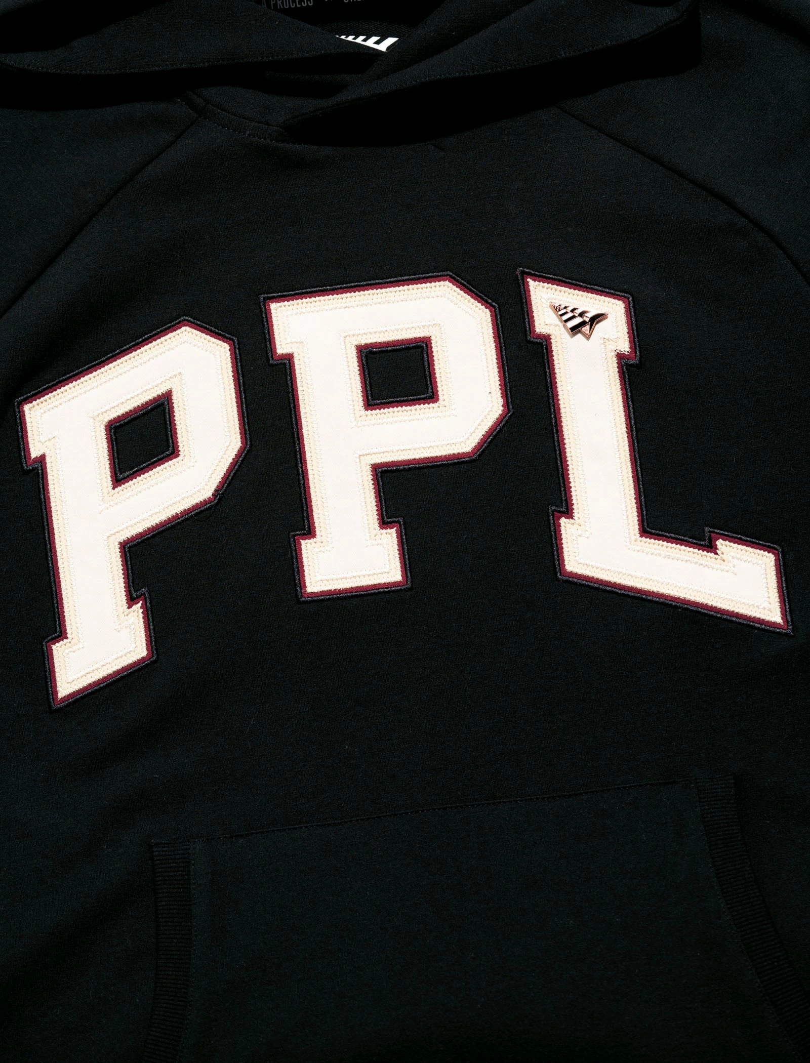 Pullover hoodie. Fixed hood. Logo initials at chest featuring logo print and rose gold detachable pin. Kangaroo pocket at front. Embroidered logo print at sleeve. Ribbed cuffs and hem. – 100% Cotton SKU: 300170