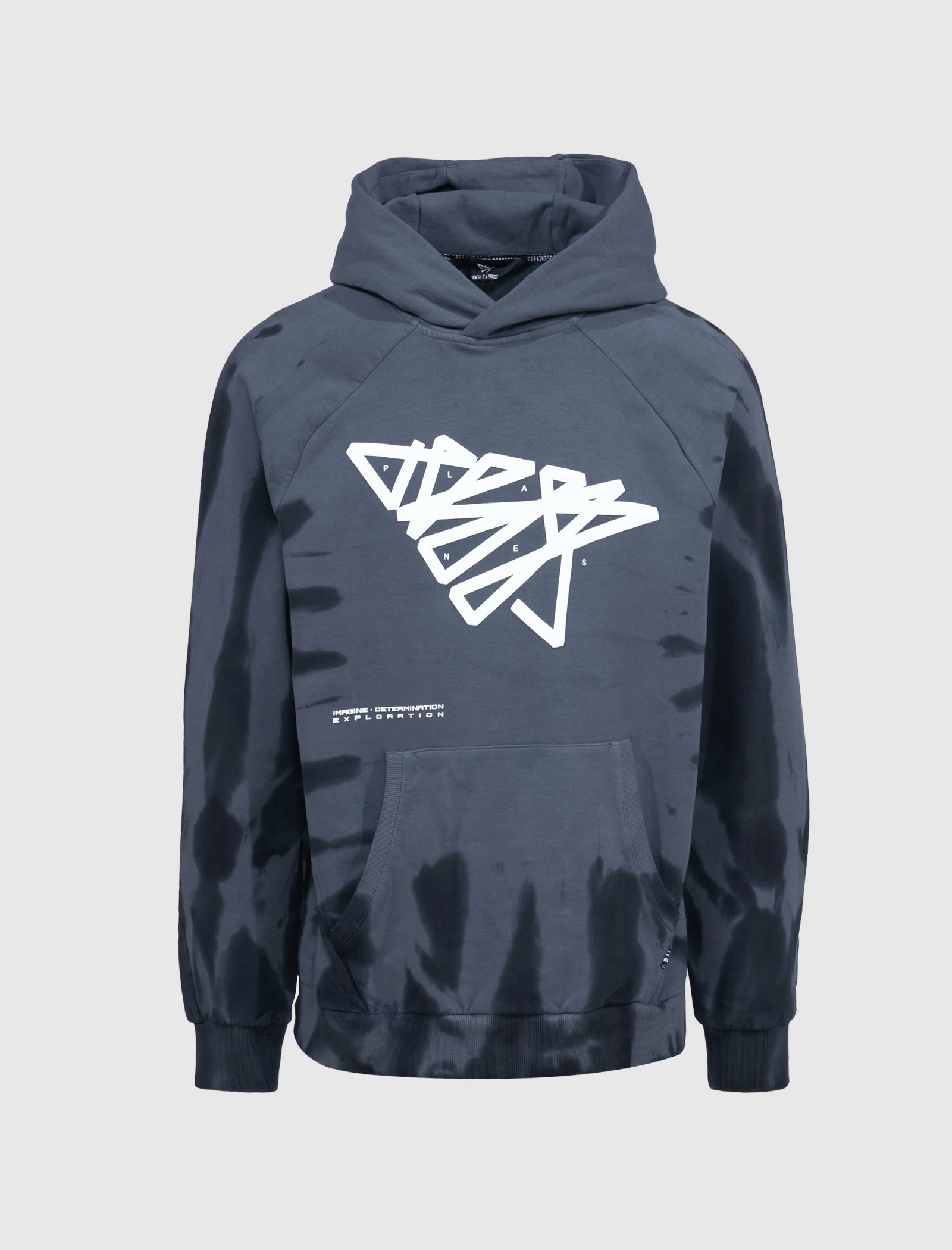 Cotton pullover hoodie. Fixed hood. Raglan sleeves. Large printed logo at center chest. Large printed logo on the back. Kangaroo front pocket. Ribbed cuffs, and hem. Tie dyed pattern all throughout. – 100% Cotton SKU: 300179-POPPY