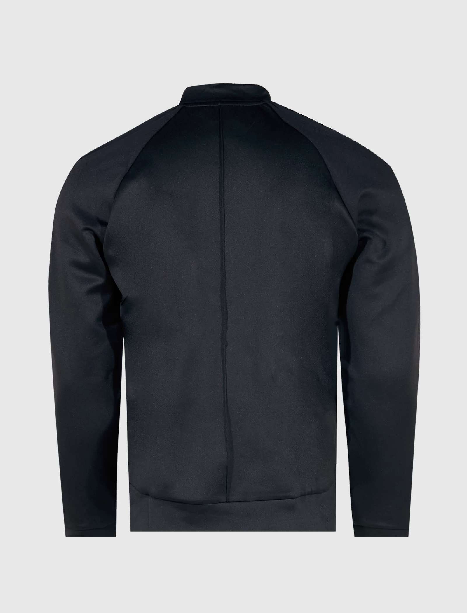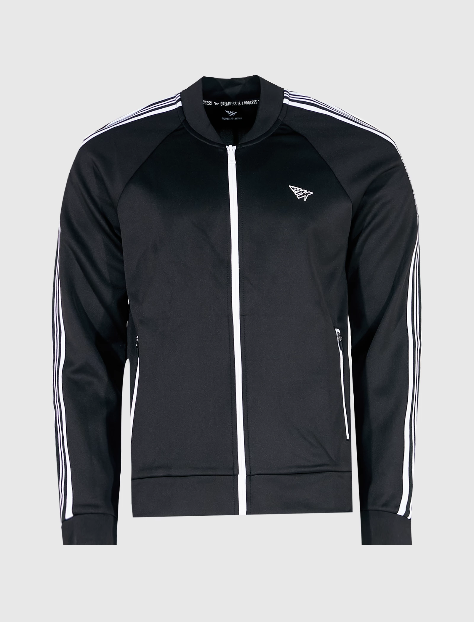 Track jacket. Ribbed logo at left chest. Full length front zip closure. Ribbed elasticated collar. Striped sleeve panels. Split back seam. Zippered side pockets. Ribbed cuffs and hem. – Polyester SKU: 300043BLK