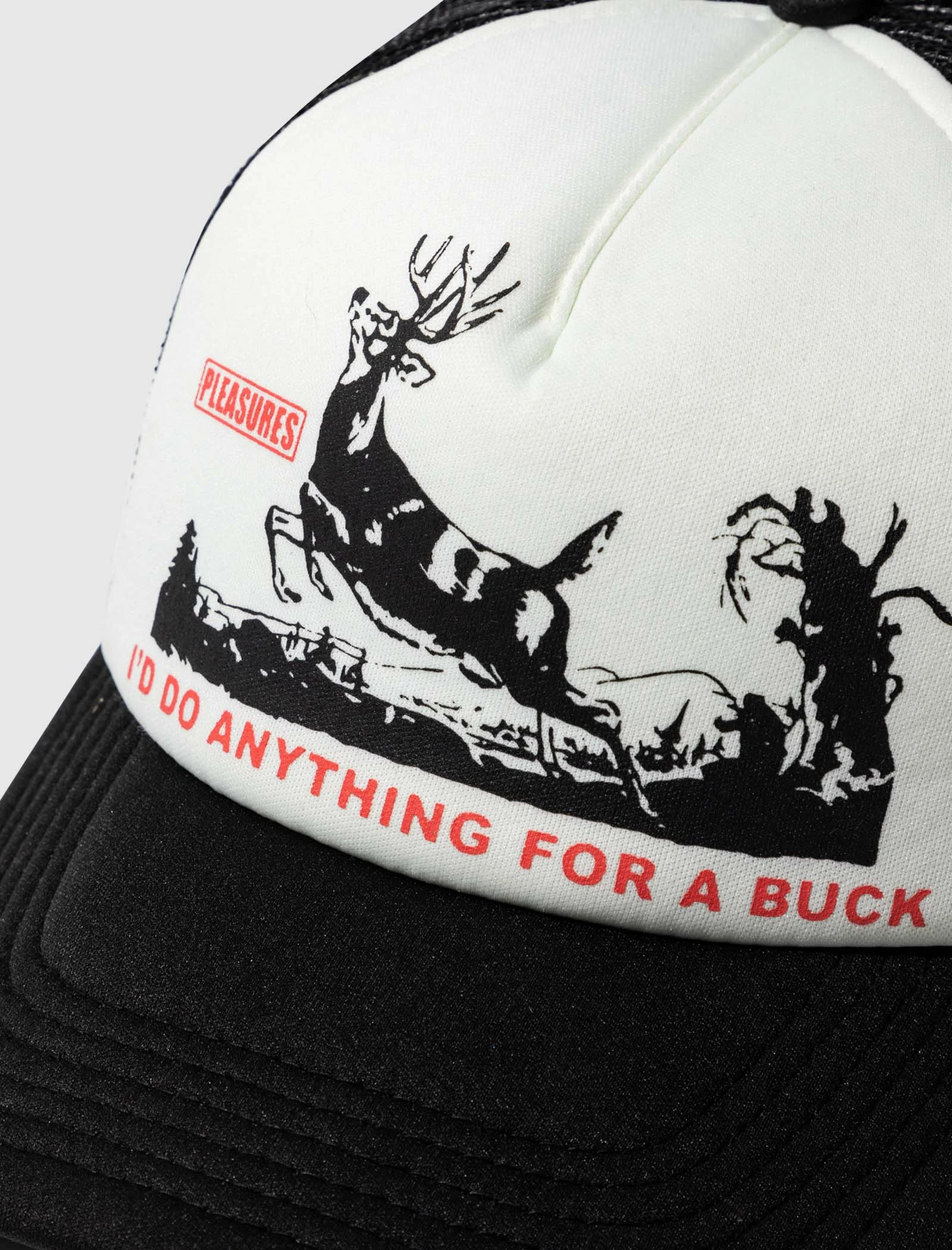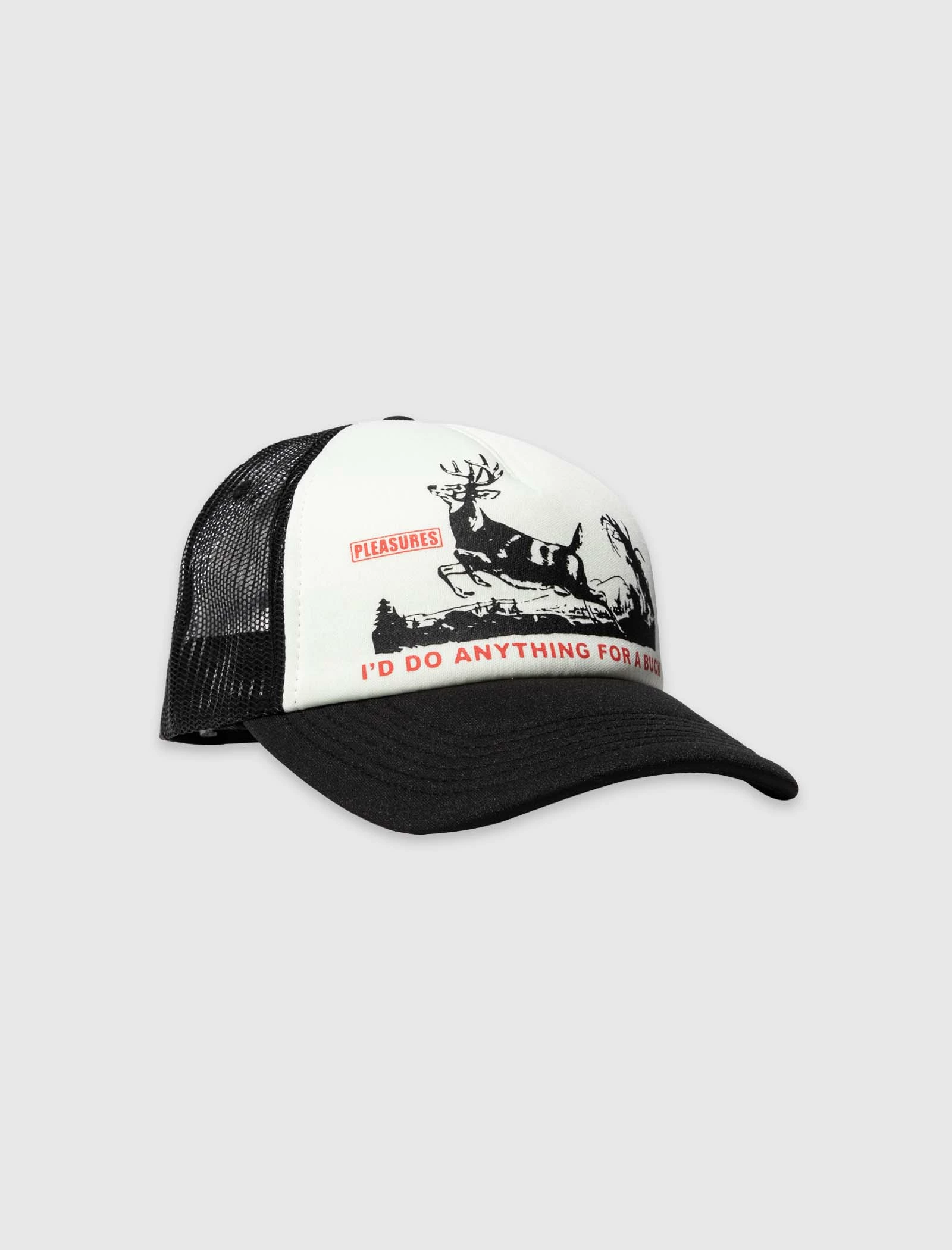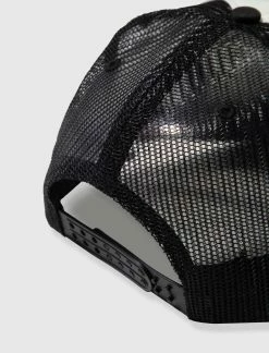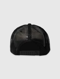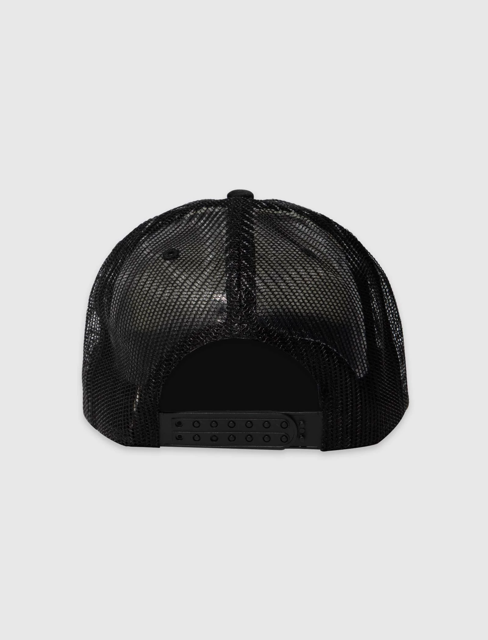 Trucker hat. Neoprene front panel. Graphic printed on the front. Curved brim. Mesh back panel. Snapback closure. – Polyester and Nylon SKU: P21W056-BLACK