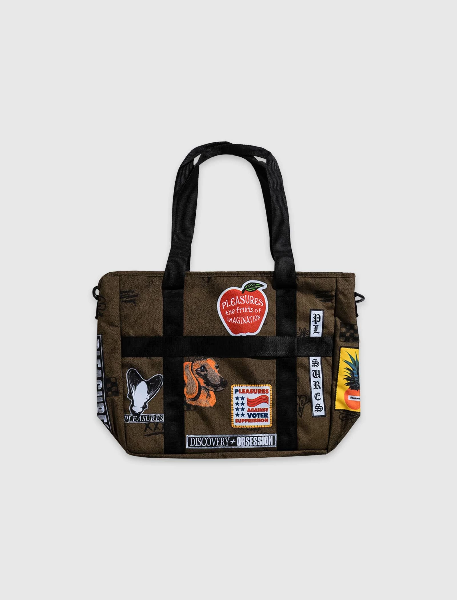 Polyester tote bag. Patches stitched all throughout. Two nylon carry handles. Removable shoulder strap attached along the sides of the bag. Padded 15-inch laptop sleeve in the interior. Zippered top fastening. Wrapping bag. – Polyester SKU: JS0A7ZNK95D-KHAKI