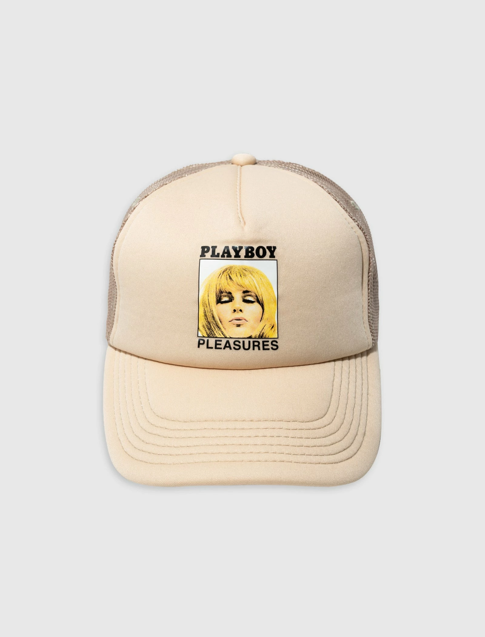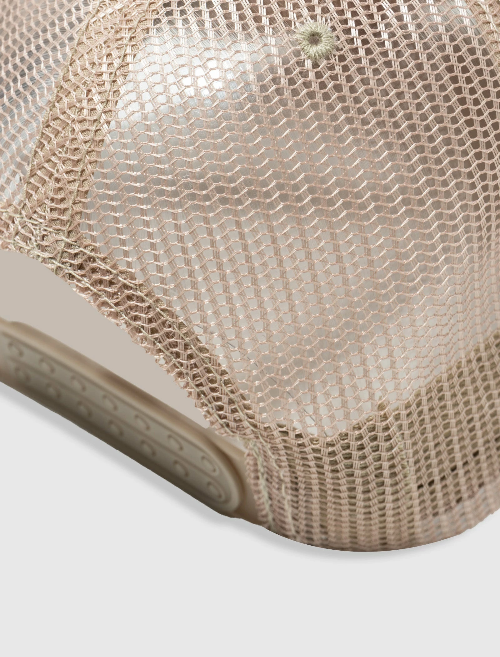 Trucker hat. Graphic print, logo text and text at front. Curved brim. Mesh panels. Adjustable snap closure at back. – 57% Polyester, 43% Nylon SKU: P22PB045-TAN